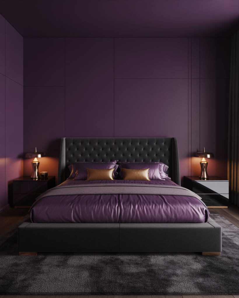 A bold Purple, black, slightly Luxury combination creates an elegant and dramatic atmosphere. Jewel-tone purples with matte black frames give the room depth while keeping it modern. I saw a showroom using these tones and was struck by how romantic and glamorous it felt without going overboard. Designers call it “confident minimal glam” for 2026.