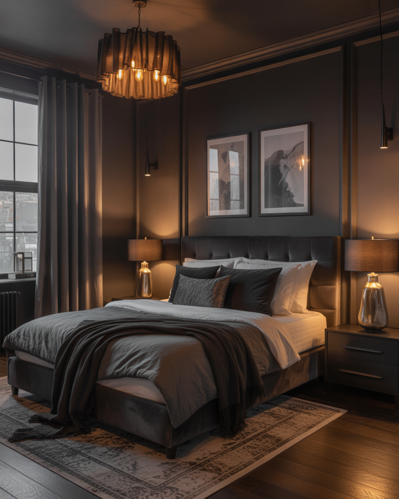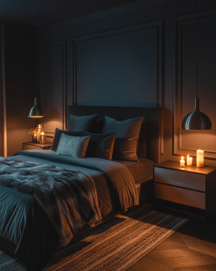 A Romantic, Dark romantic, slightly black-accented bedroom offers depth and intimacy, especially appealing for couples who love atmospheric spaces. Rich charcoal, plum, or espresso tones can make the room feel cocoon-like without overwhelming it. I once painted a bedroom wall in deep slate, and it instantly became the most relaxing spot in the home. Decor experts at Elle Decor say dark palettes are trending for 2026.