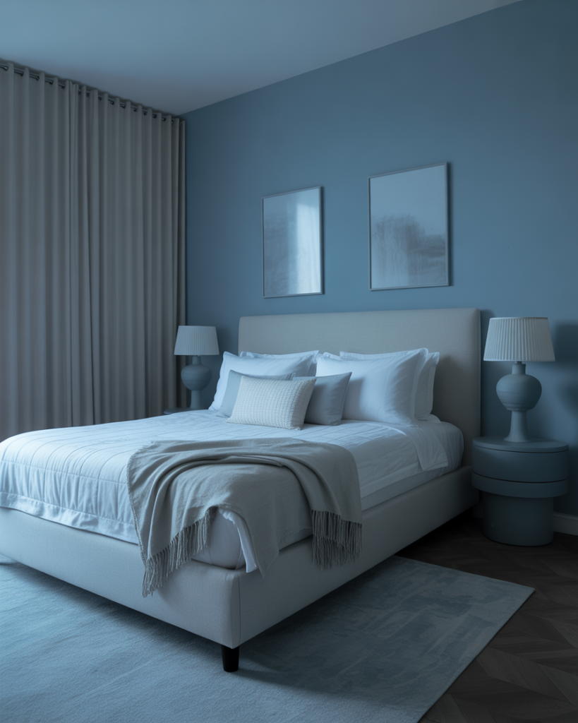 A Blue, Cozy, slightly aesthetic palette brings balance and emotional softness, ideal for partners with hectic schedules. From powder blue linens to navy frames, this palette feels timeless. A friend once told me her blue-themed room helped her and her husband sleep better—color psychology supports that idea. Many designers highlight blue as the universal compromise shade for couples in 2026.