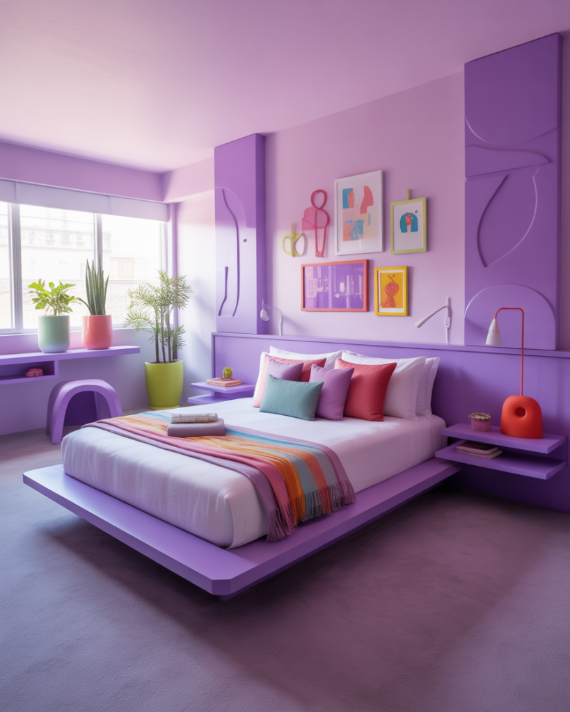 A Fun, Cute, subtly Purple or mixed-color room works for couples who love energy and joy. Small bursts of color—pillows, lamps, art—can brighten the mood without overwhelming the space. My friends with artistic personalities say playful decor keeps their room feeling alive. Designers at MyDomaine suggest that cheerful touches promote day-to-day positivity.