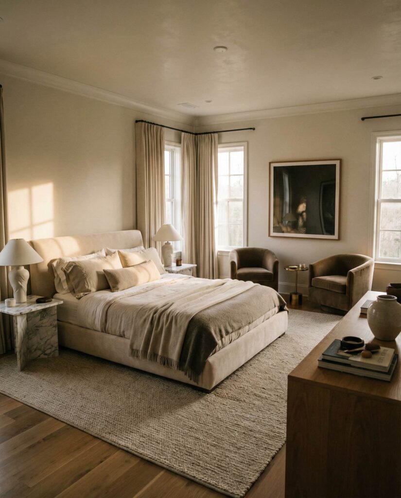 Neutral bedrooms are evolving through texture rather than color, shaping a new wave of design luxury classy interiors. This idea layers stone, linen, leather, and wood in subtle tones to create richness without visual noise. I’ve often observed that clients who once wanted bold accents now prefer this quieter design luxury approach because it feels timeless and grounded. It works especially well in a design luxury master suite, where comfort, restraint, and refined Aesthetic values matter more than trends.