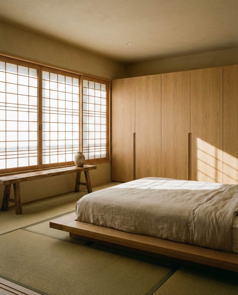 The influence of Japanese interiors extends beyond aesthetics into how bedrooms function. In this idea, storage is concealed, circulation is fluid, and every element earns its place. This philosophy aligns perfectly with design modern master simple layouts, where visual calm supports mental clarity. I’ve seen how integrated cabinetry and low-profile beds reduce daily friction, turning the bedroom into a true retreat. It’s design luxury classy through discipline, not decoration.