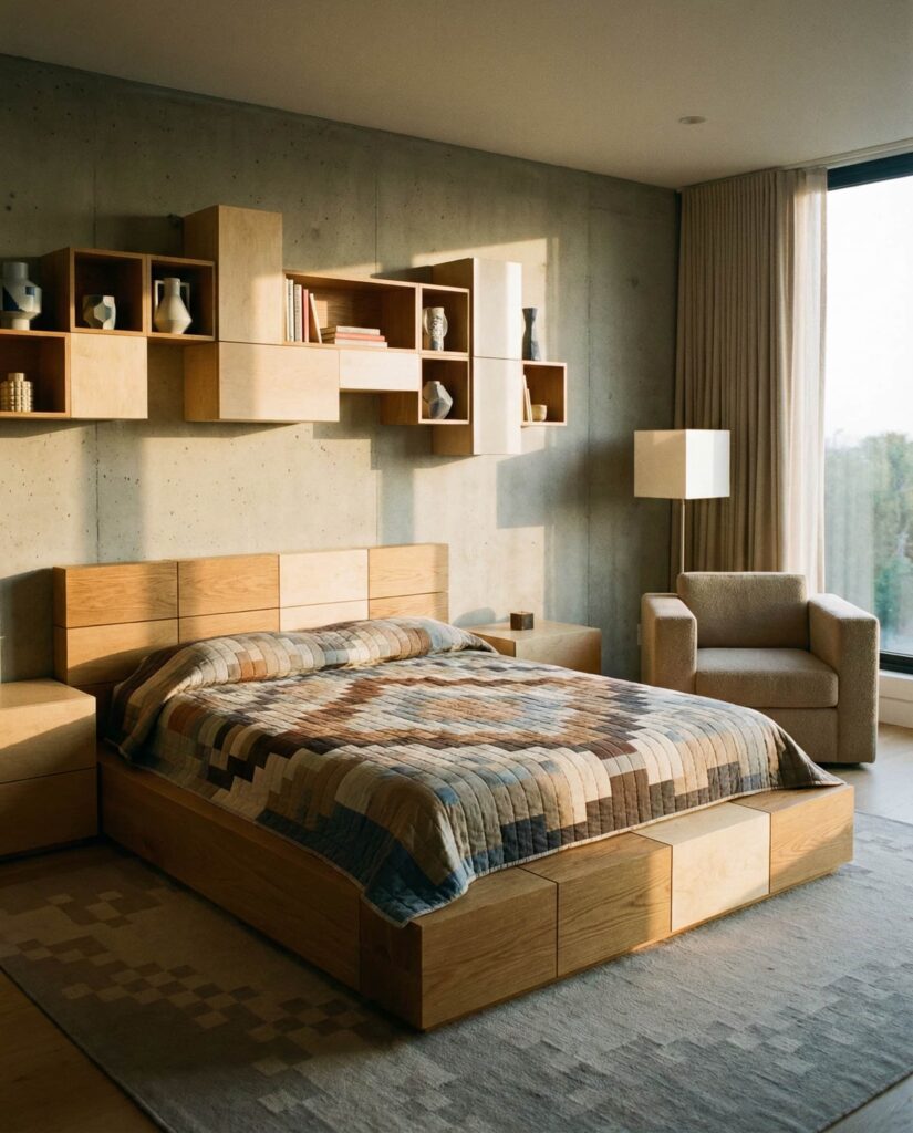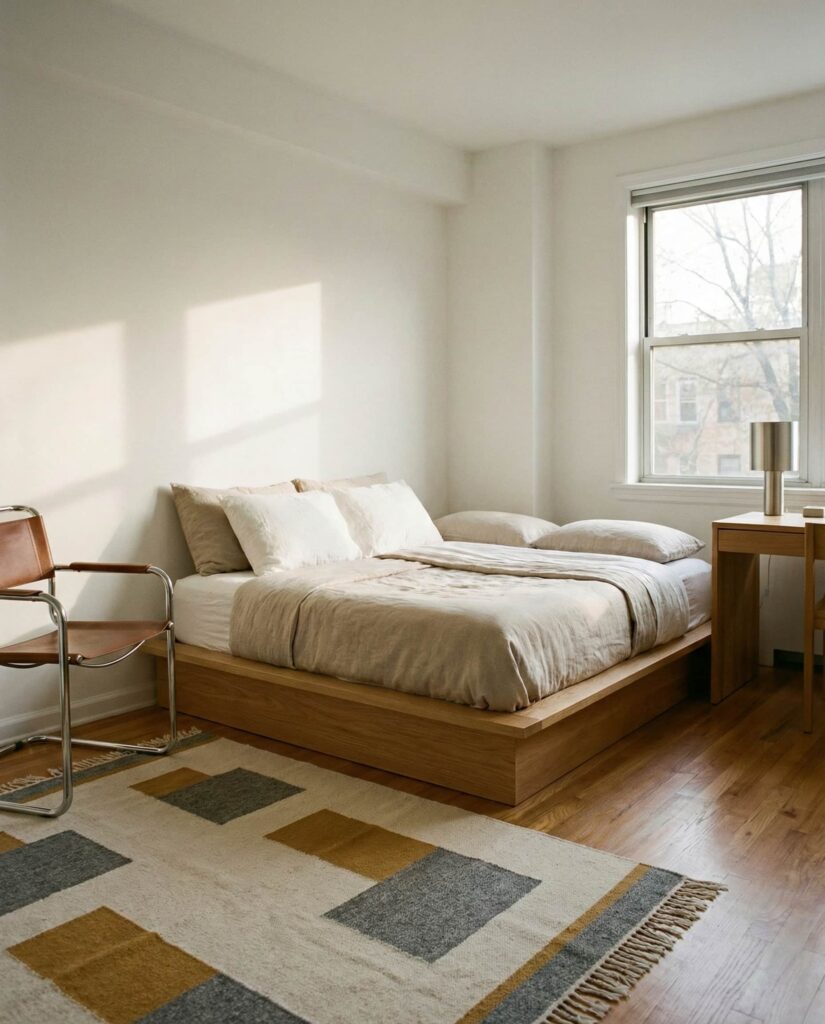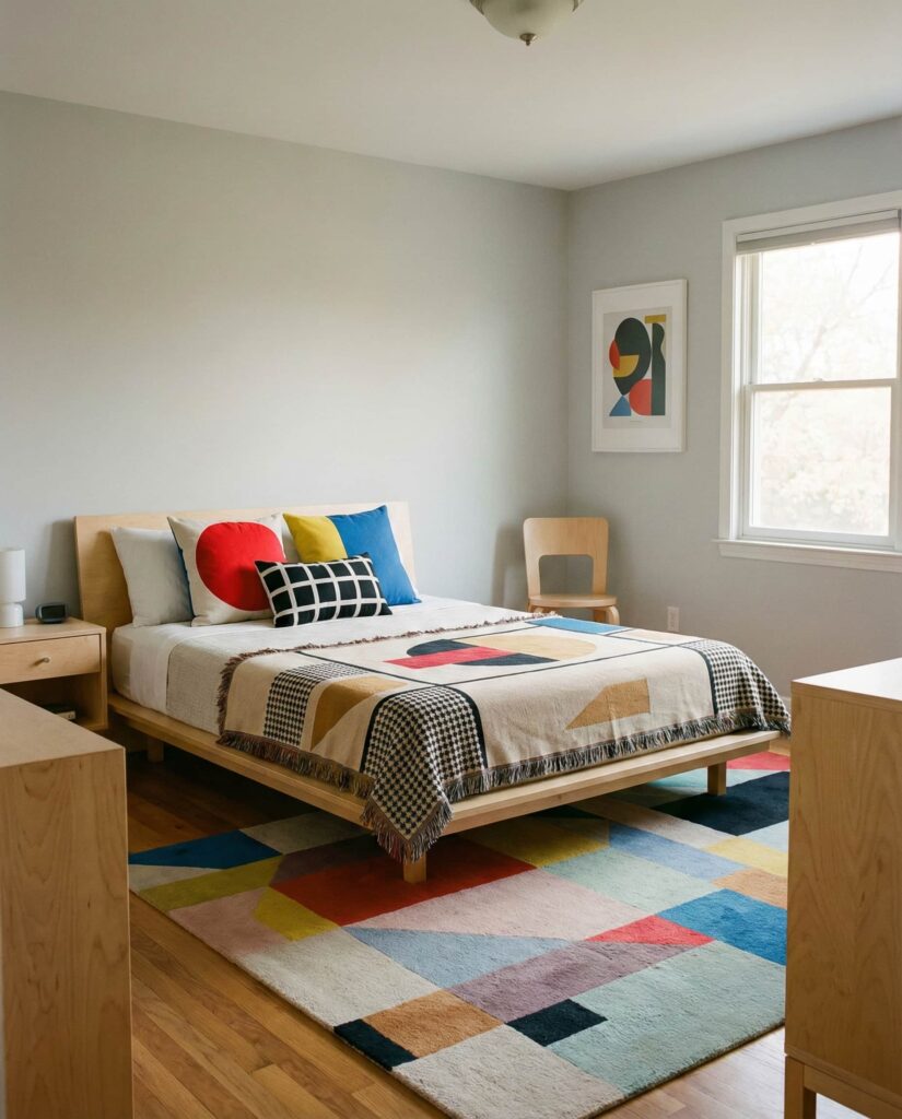 Rather than architecture, Bauhaus influence now appears in bedroom textiles. Think geometric rugs, graphic cushions, and structured bedding patterns applied sparingly. This idea is perfect for renters wanting design ideas without permanent changes. I’ve seen how a single bold rug can anchor an otherwise Simple room, adding personality while staying true to design modern roots.