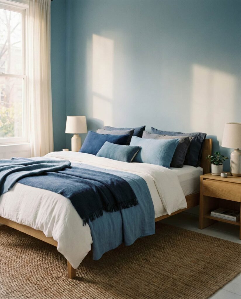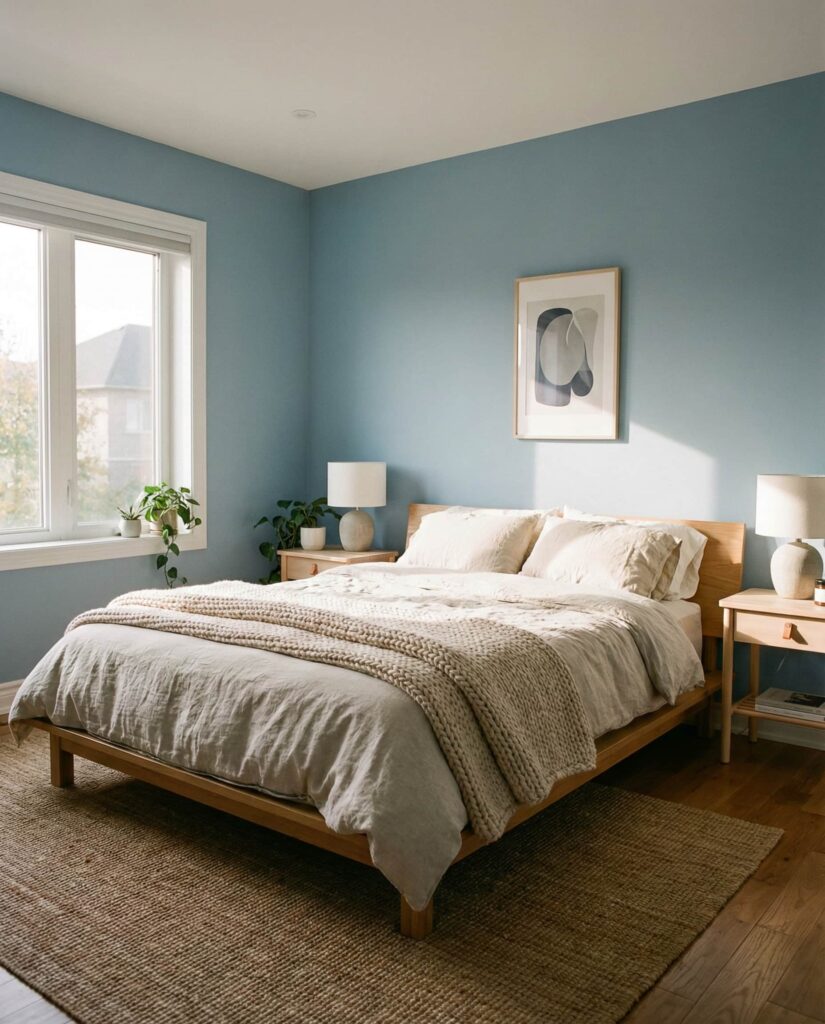 Combining Blue with warm neutrals continues to define calming Masterbedroom spaces. This palette supports rest while still feeling modern and intentional. I often hear from readers that blue-based bedrooms feel cooler emotionally, especially when balanced with wood or linen. It’s a reliable design modern master simple solution that ages well.