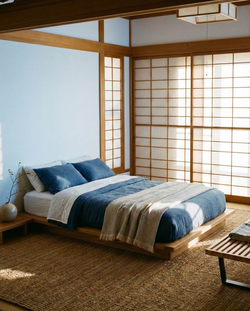 Blending Japanese principles with a Blue and White palette creates bedrooms that feel both serene and contemporary. This idea emphasizes balance, symmetry, and intentional emptiness, aligning perfectly with ideas modern for rest-focused spaces. I’ve seen how this restrained design approach appeals to homeowners overwhelmed by visual clutter, offering clarity and emotional calm. Natural materials, low furniture, and disciplined Colour use make this style quietly powerful and deeply restorative.