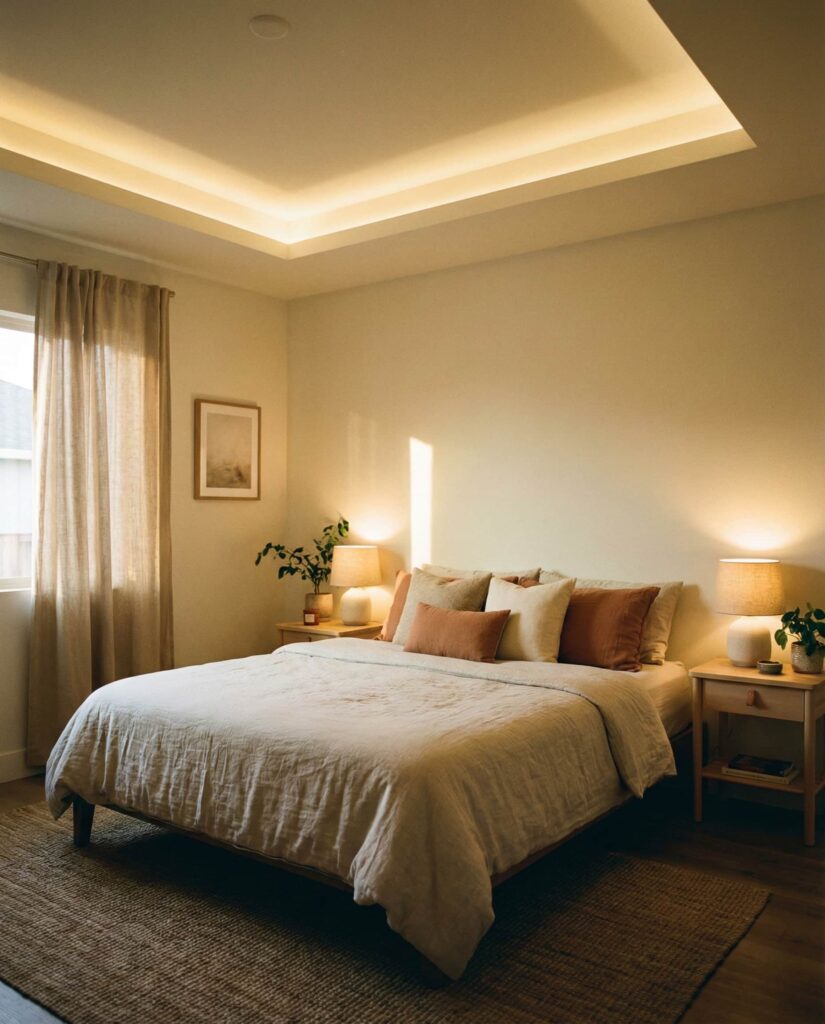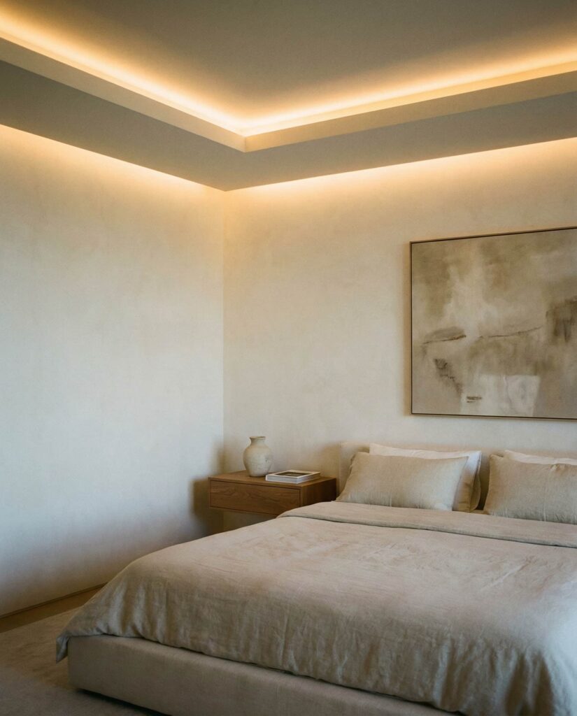 This approach focuses on Ideas ceiling modern that hide light sources within architectural details. Cove lighting installed along the Ceiling edge creates a soft Ambient glow that visually lifts the room without glare. These Fixtures ceiling work especially well in contemporary bedrooms where clean lines matter. The indirect light feels Cozy and controlled, offering subtle Inspiration while keeping the overall Design calm and uncluttered. It’s a solution often recommended by lighting editors at Architectural Digest for people who want atmosphere without visible hardware dominating the space.