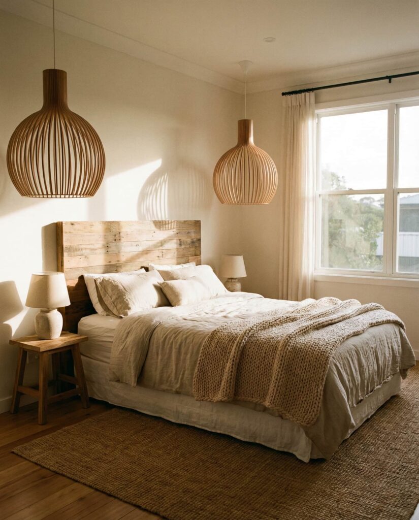 Lighting Fixtures made from Wood add warmth and depth to modern bedrooms. These Ideas focus on natural finishes that soften clean architectural lines. Wood-based lighting works well as bedside lamps, pendants, or ceiling accents, creating a tactile Aesthetic that feels timeless. The warm light enhances the material’s grain, reinforcing a Cozy and welcoming environment.