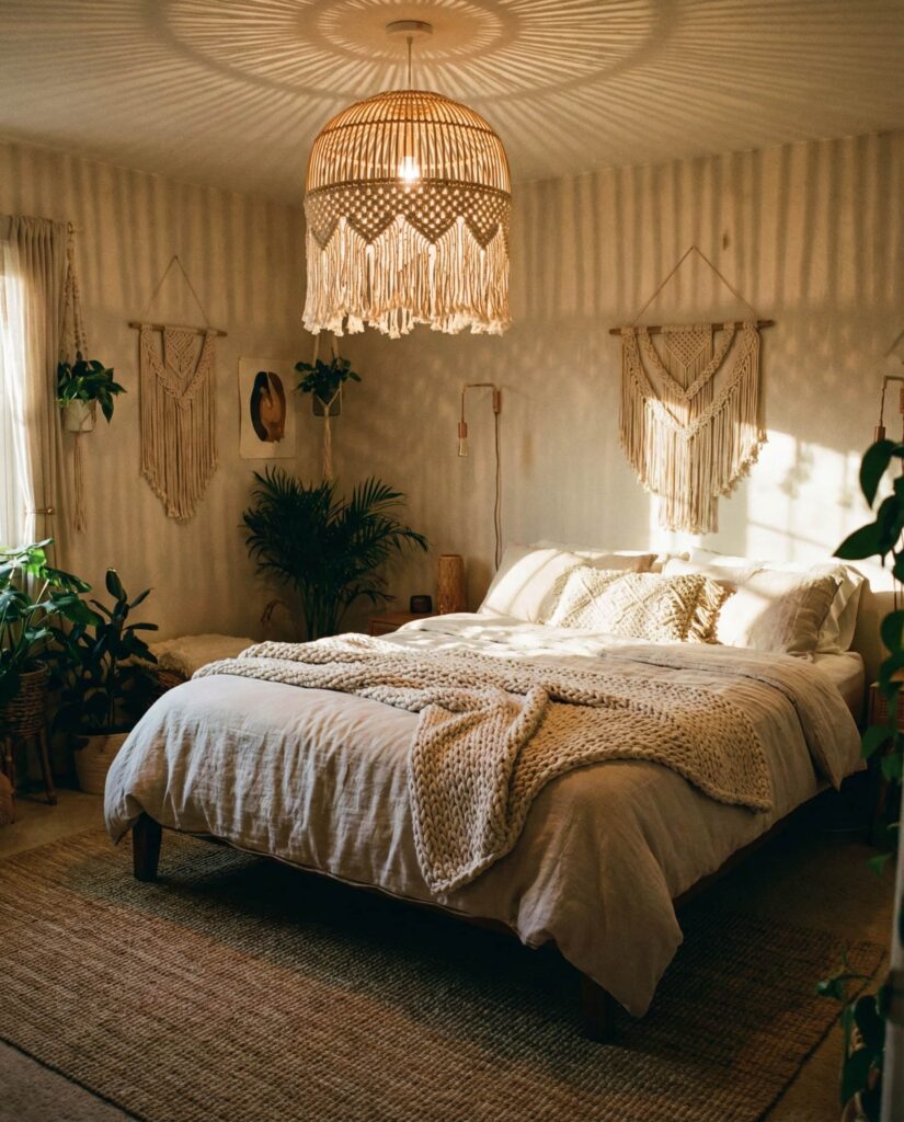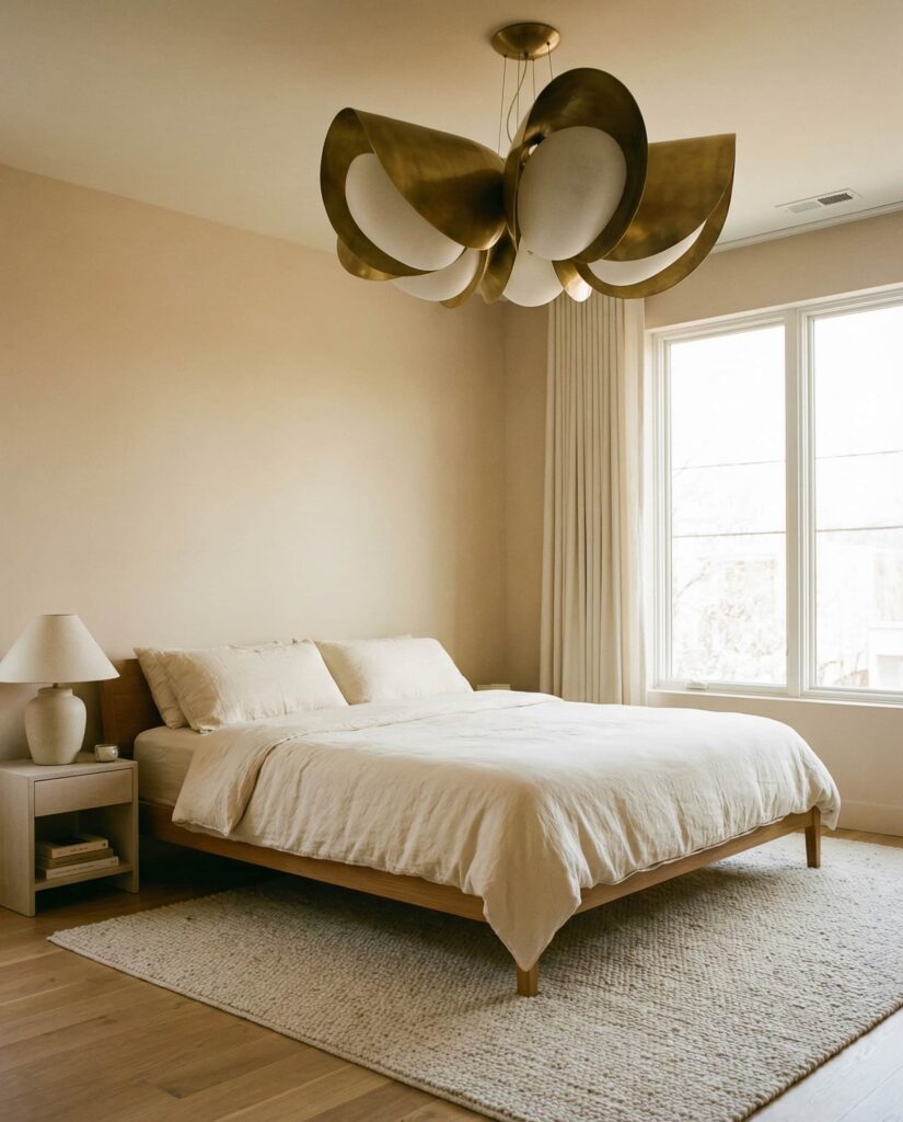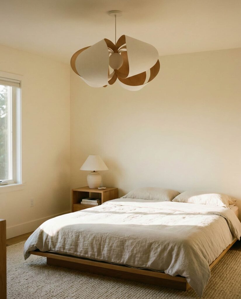 This concept blends Boho style with expressive Ideas ceiling choices. Woven or rattan Fixtures ceiling add texture and warmth while casting interesting shadows. The light feels casual and artistic, perfect for bedrooms that value individuality over strict symmetry. This lighting style brings organic Inspiration and a relaxed Aesthetic that feels collected rather than curated.