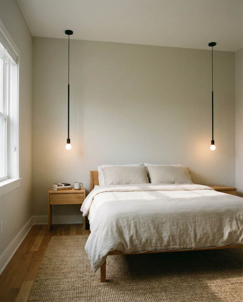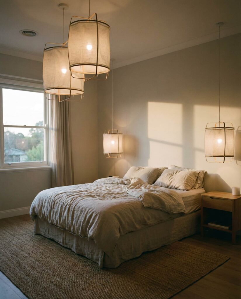 Symmetry-driven Ideas hanging place Hanging lights on both sides of the bed to frame the sleeping area. These Fixtures replace traditional lamps while adding architectural interest. The focused light creates intimacy and visual order, which many designers consider essential for restful bedrooms. This approach feels intentional, Modern, and space-saving, especially in rooms where surface space is limited.