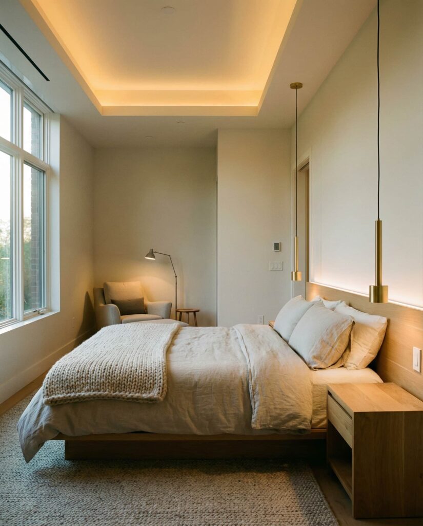 Refined Ideas hanging lighting emphasizes restraint and proportion. Slim Hanging fixtures placed with precision add structure while keeping the bedroom visually light. These Modern solutions work especially well in minimalist spaces where every detail matters. Rather than acting as decoration alone, the Fixtures support a thoughtful lighting Plan that balances form and function. The result is a bedroom that feels intentional, calm, and quietly sophisticated without relying on excess ornamentation.