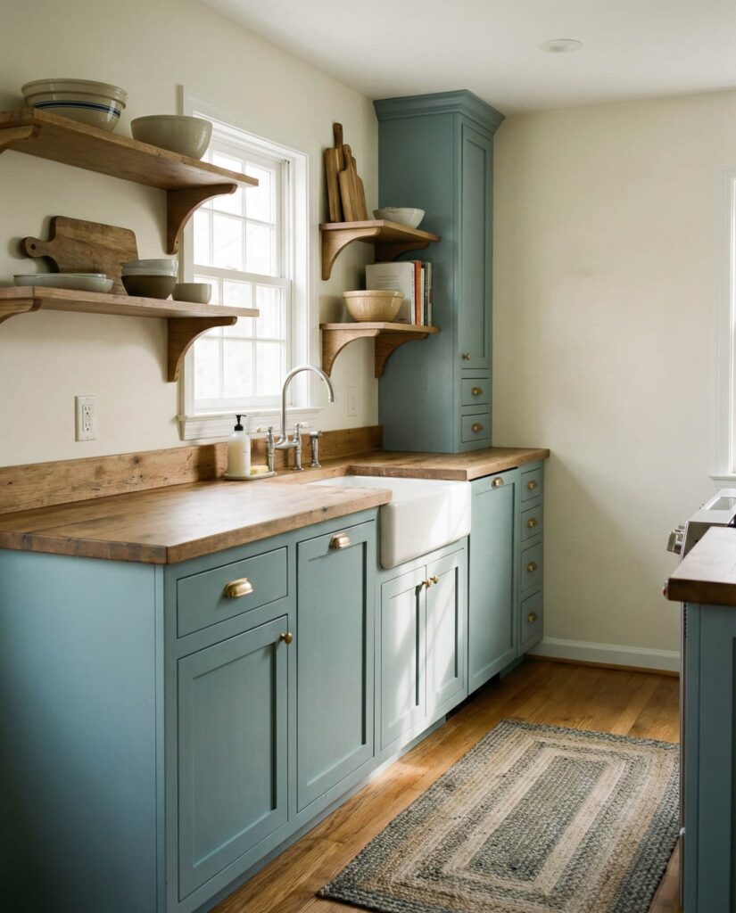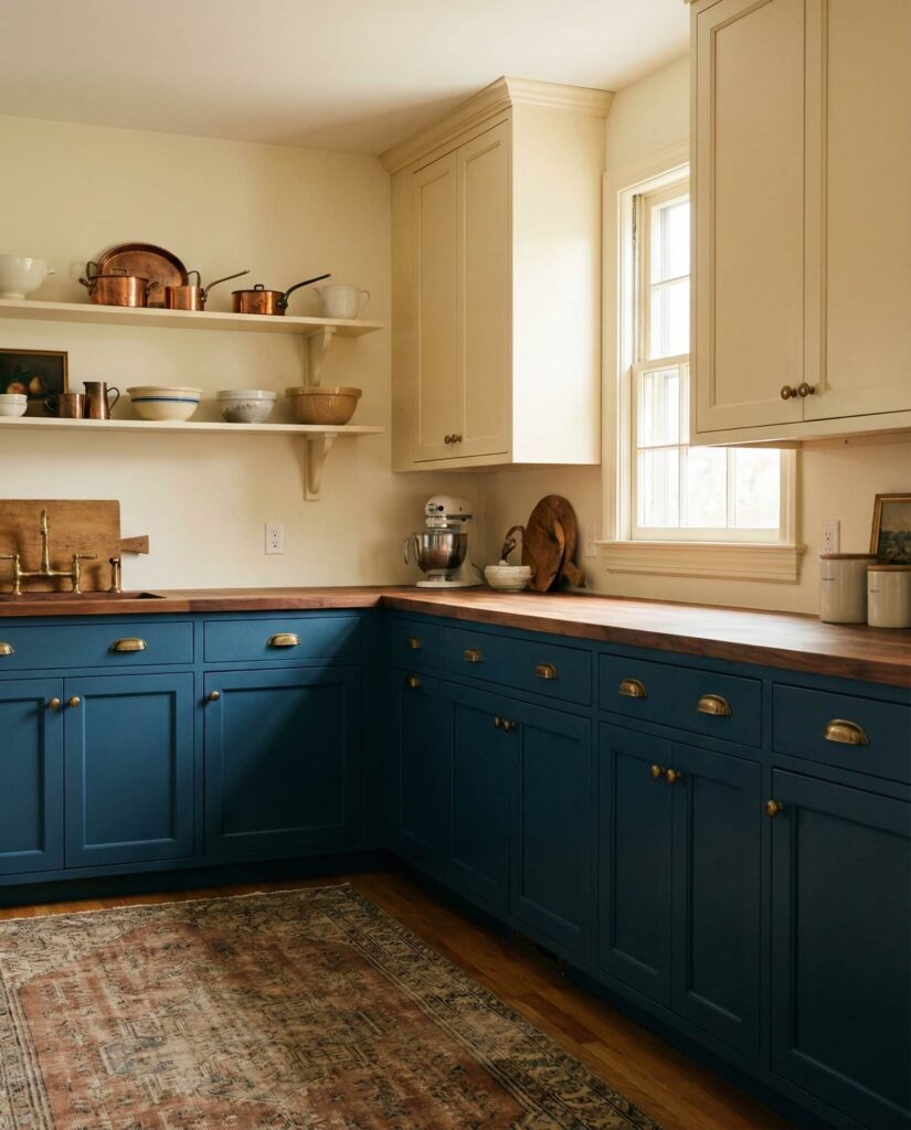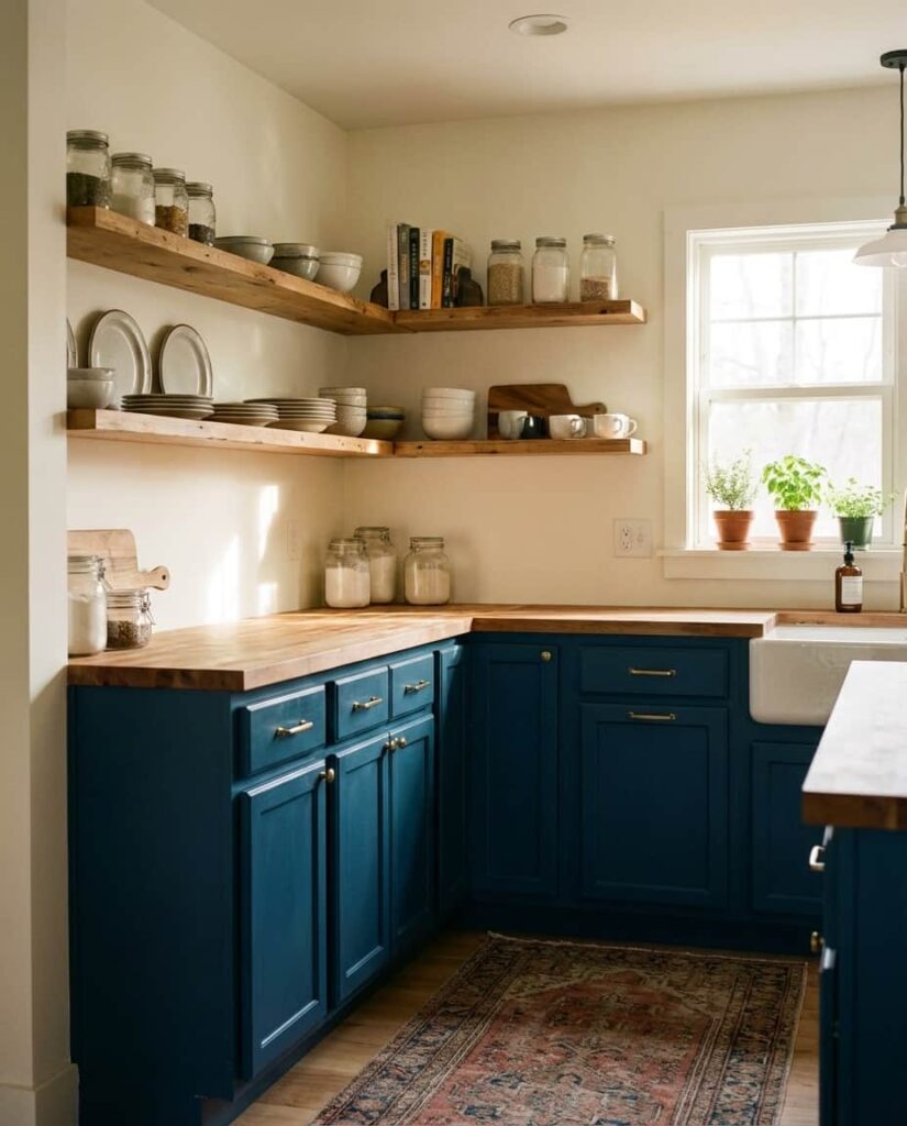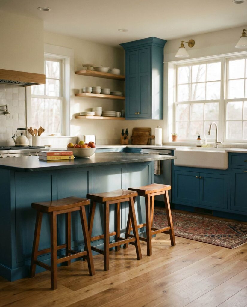 Pairing blue Cabinets with Wood and open shelving creates depth and visual rhythm in modern family kitchens. This idea focuses less on color saturation and more on material contrast. I’ve noticed homeowners gravitating toward this look when they want warmth without sacrificing a clean interior designs approach. Blue grounds the lower cabinetry, while exposed wood shelves soften the overall feel and make the kitchen look lived-in. Neutral Walls and restrained Decor prevent clutter, while everyday items double as styling elements. It’s practical, personal, and very much aligned with how Americans actually use their kitchens daily.