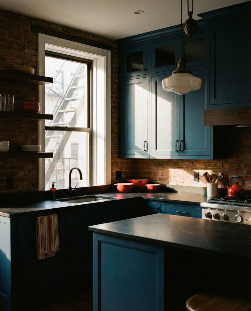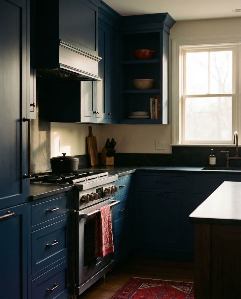 A Moody blue kitchen paired with Red and darker accents is a bold but increasingly popular direction. Deep blue Cabinets set a dramatic tone, while subtle red details—like vintage rugs or cookware—add warmth and contrast. I’ve seen this style embraced in city homes and renovated lofts, where character matters more than brightness. Dark Walls or low lighting enhance the Aesthetic, creating a kitchen that feels intimate and expressive rather than purely functional.