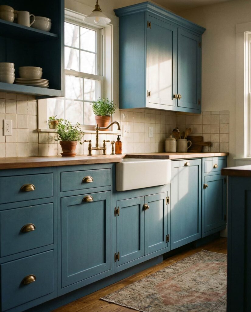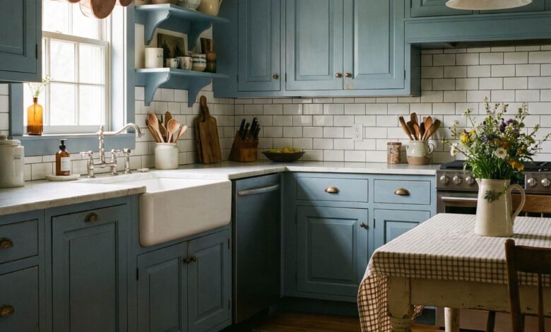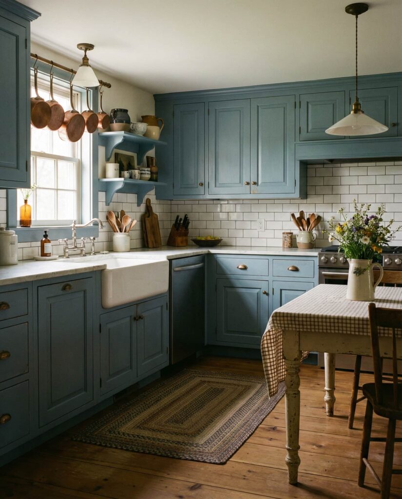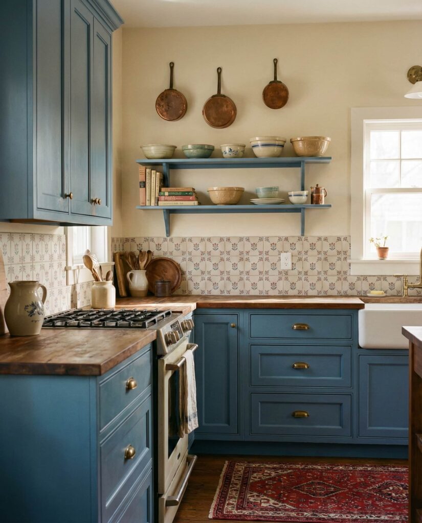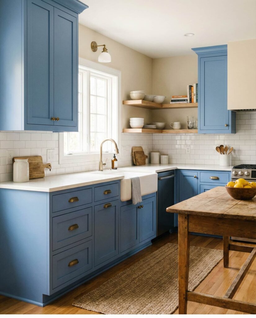 In Country homes, blue often appears softer and more layered. This idea embraces muted blue Cabinets, classic hardware, and traditional Backsplash ideas like beadboard or handmade tile. I’ve seen this style resonate with homeowners who value comfort over perfection. The charm lies in subtle imperfections—slightly worn finishes, collected Decor, and familiar layouts. Light Walls keep the room from feeling heavy, while blue adds personality without overpowering the space. It’s a reminder that good kitchen designs don’t have to chase novelty to feel current.
