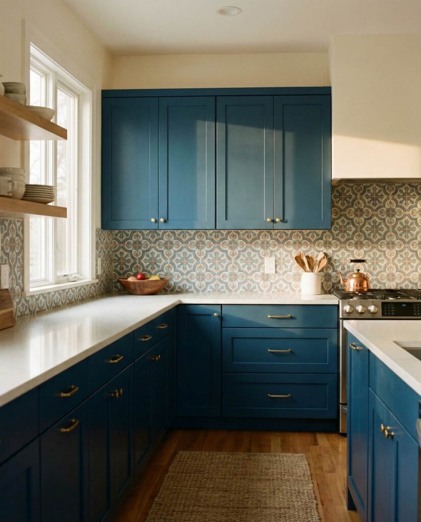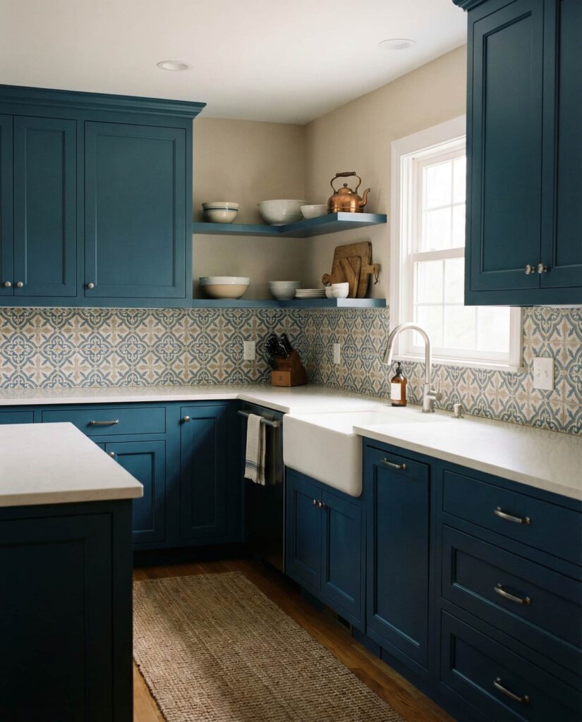 Some of the most memorable blue kitchens I’ve seen rely on expressive Backsplash ideas rather than bold cabinetry. Here, blue Cabinets serve as a calm foundation while patterned or textured tile adds movement and personality. Designers often choose handmade or geometric tiles to introduce subtle color variation. Neutral Walls and minimal Decor ensure the backsplash doesn’t overwhelm the space. This idea suits homeowners who enjoy visual interest but still want a kitchen that feels practical and grounded.