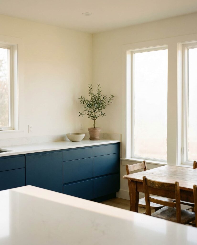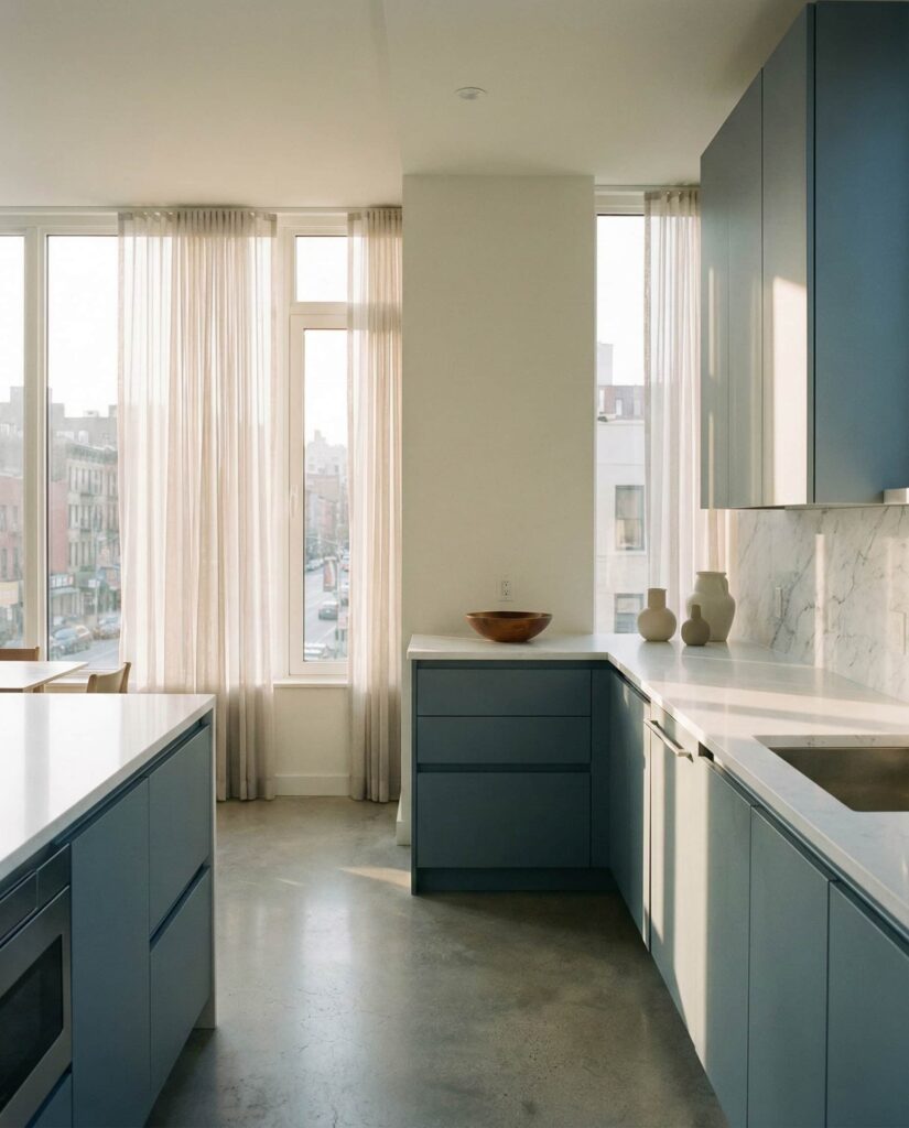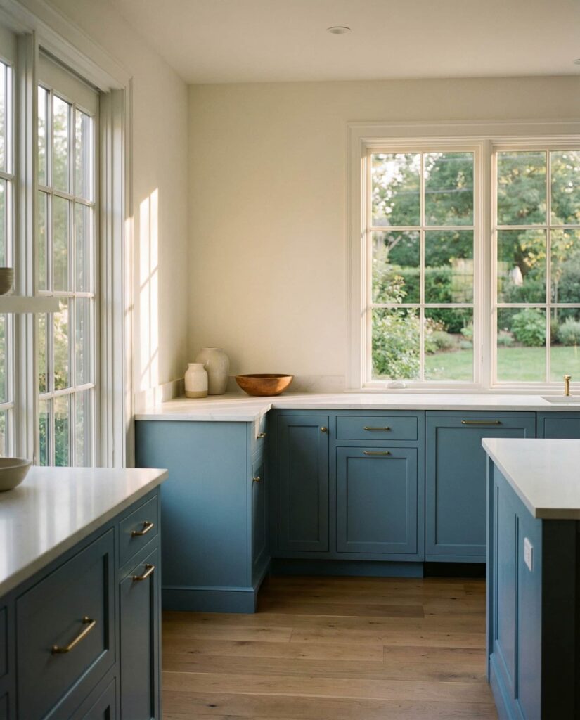 22. Blue Kitchens with Natural Light and Minimal Decor