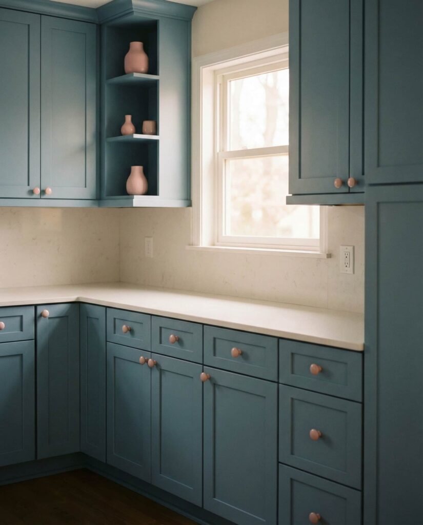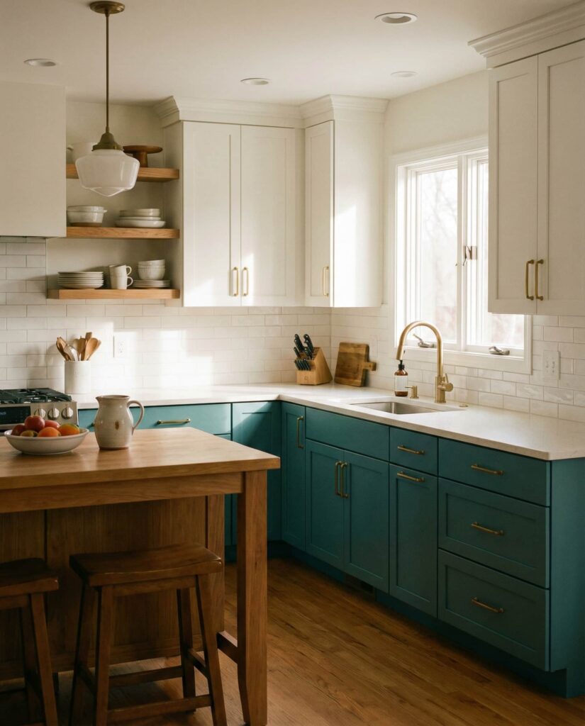 Teal sits between blue and green, making it one of the most expressive Cabinets ideas for homeowners craving personality. In recent projects, I’ve seen teal used confidently across lower Cabinets, paired with brass pulls and light Walls. The result feels rich but not heavy. Designers often keep the Backsplash ideas simple—white tile or natural stone—to let the color shine. Teal works especially well in kitchens that receive plenty of natural light, where it shifts subtly throughout the day and keeps the space feeling alive.
