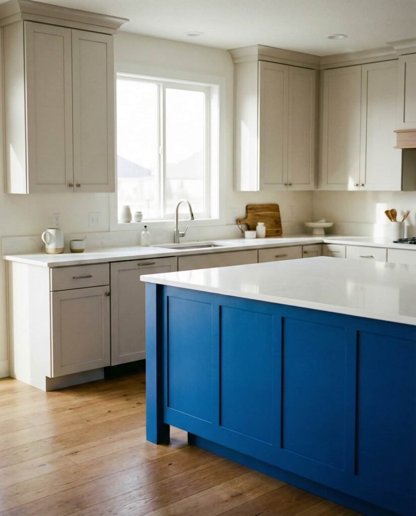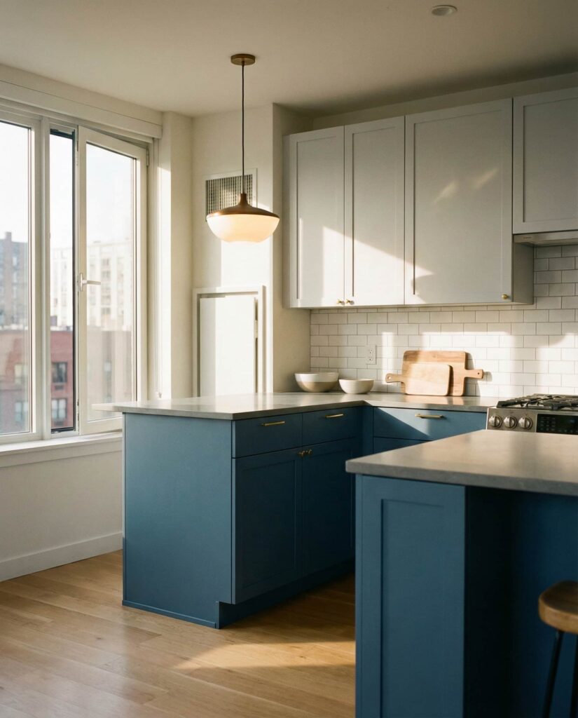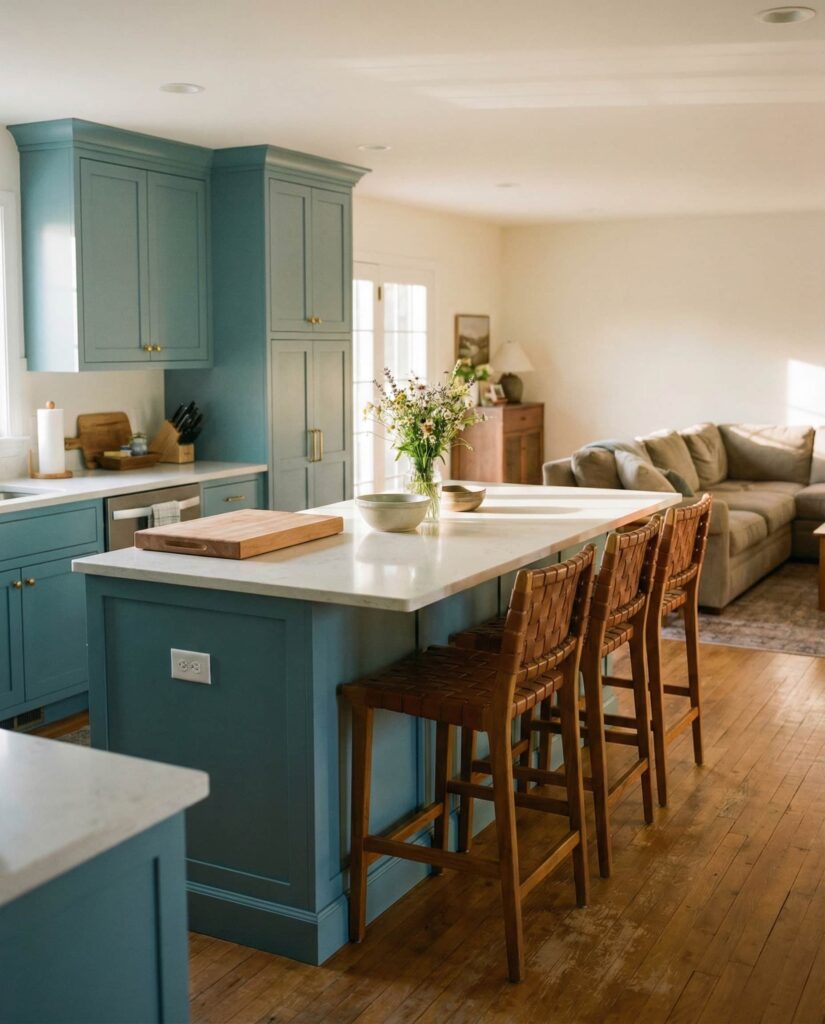 An Island isn’t just for prep anymore—it’s the social heart of many kitchens. In this idea, blue cabinetry extends to the island, creating visual continuity. I’ve noticed this works especially well in open layouts where the kitchen connects to living areas. Blue grounds the space, while wood stools and subtle Decor add comfort. Neutral Walls ensure the island feels welcoming rather than imposing, making it ideal for everyday meals and casual gatherings.