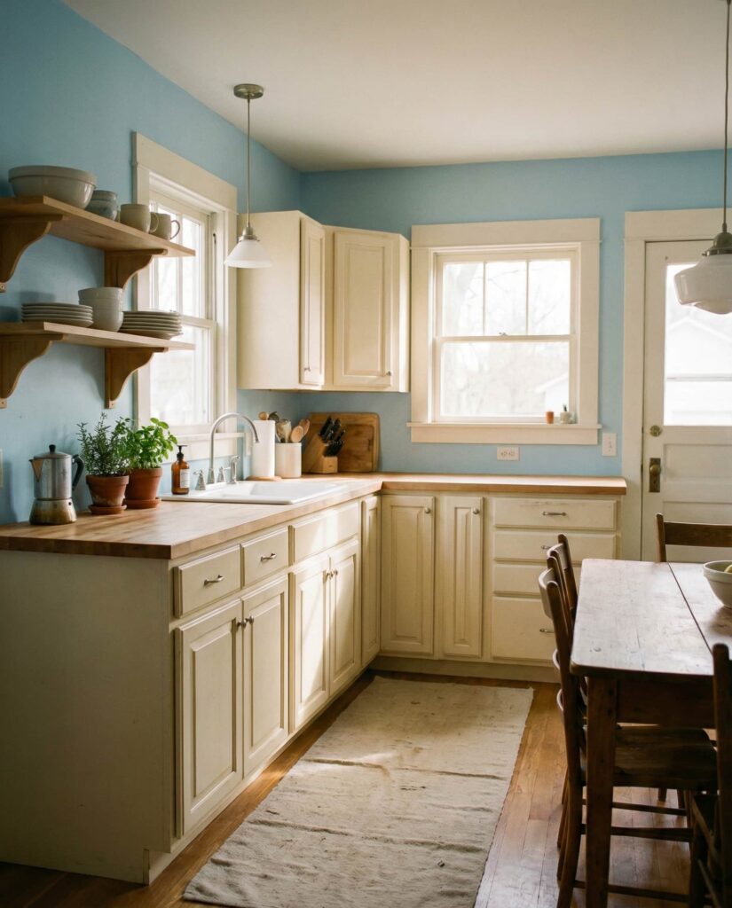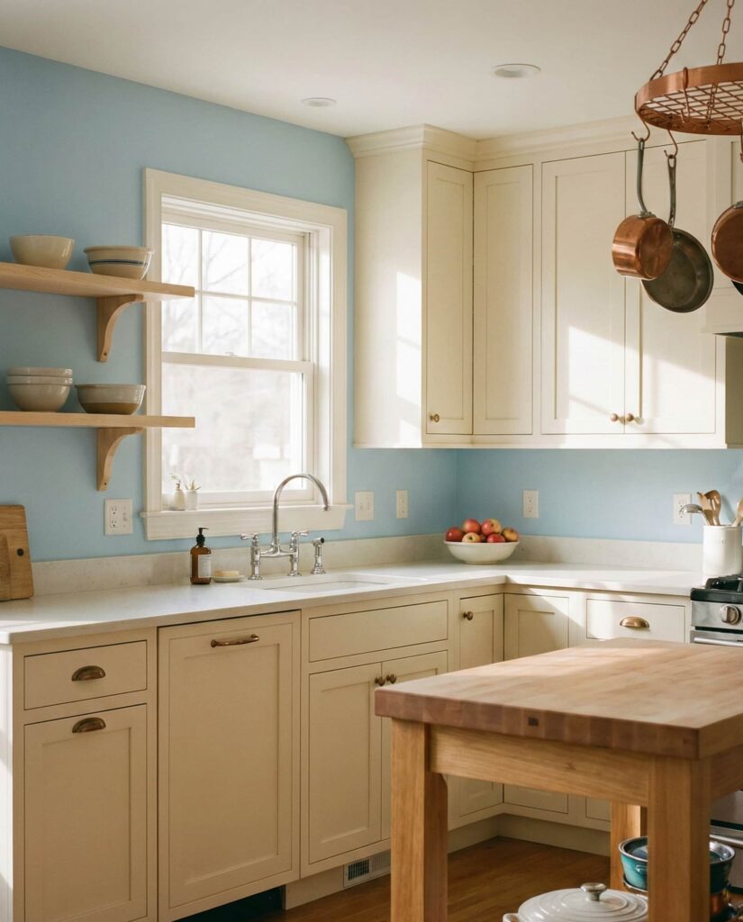 Using Pastel blue on Walls instead of cabinetry is a quiet but effective idea for those easing into color. When paired with Cream and warm whites, pastel blue creates an airy backdrop that feels clean without feeling cold. I’ve seen this work beautifully in older homes where changing Cabinets isn’t practical. The color reflects light gently, making kitchens feel larger and more relaxed. Designers often layer subtle Decor—wood stools, woven shades, or stoneware—to avoid a flat look. This approach suits homeowners who want a fresh update while keeping their kitchen flexible and timeless.