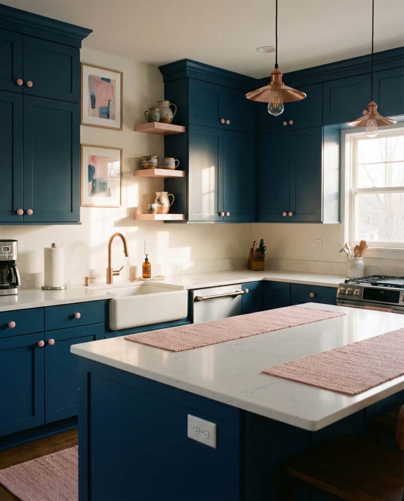 For those drawn to depth and drama, Moody blue kitchens paired with dark stone counters offer a rich Aesthetic. Deep blue Cabinets anchor the room, while charcoal or black surfaces add contrast. I’ve seen this idea succeed when lighting is carefully planned—warm fixtures prevent the space from feeling heavy. Minimal Decor and restrained Backsplash ideas keep the focus on materials. It’s a confident choice that turns the kitchen into a statement rather than just a utility space.