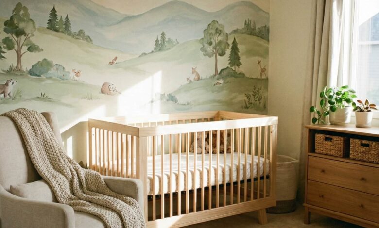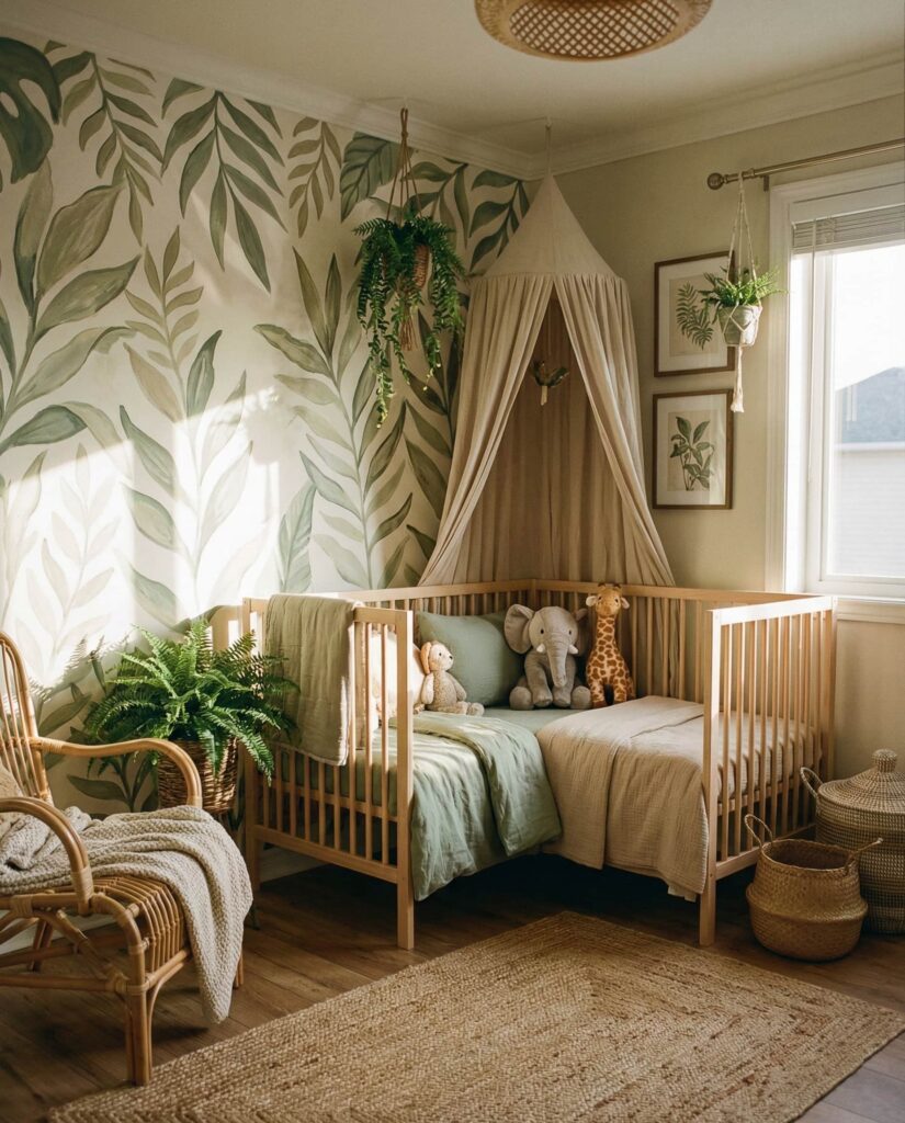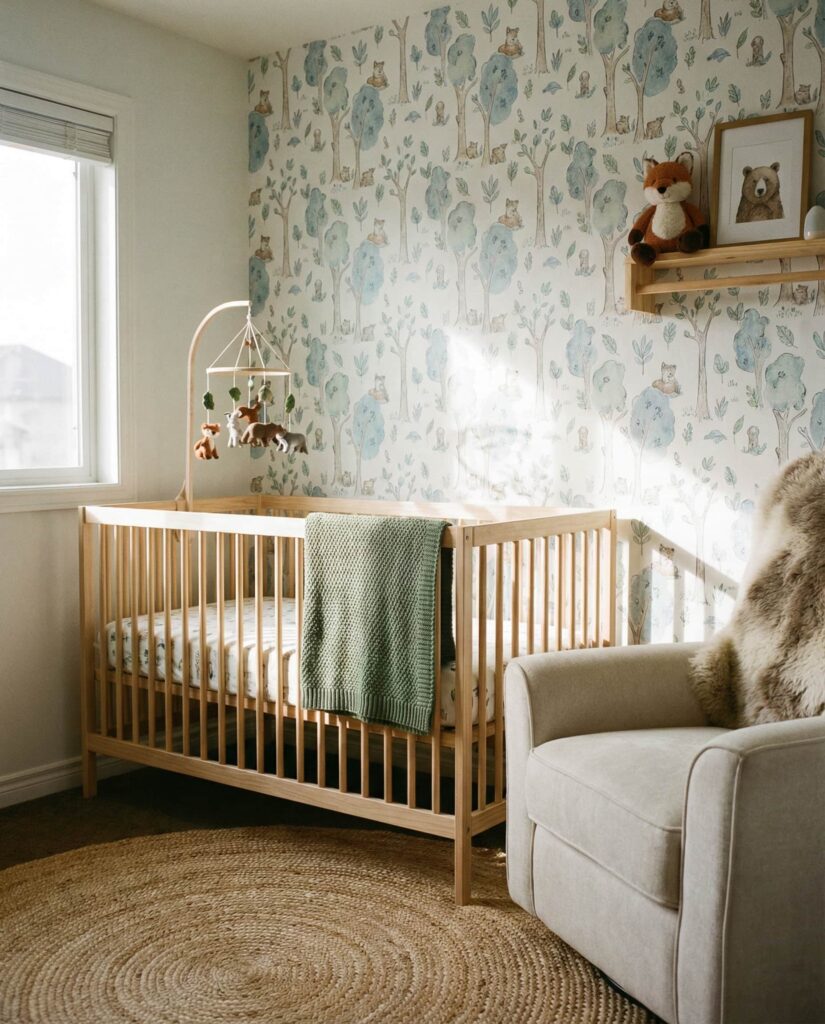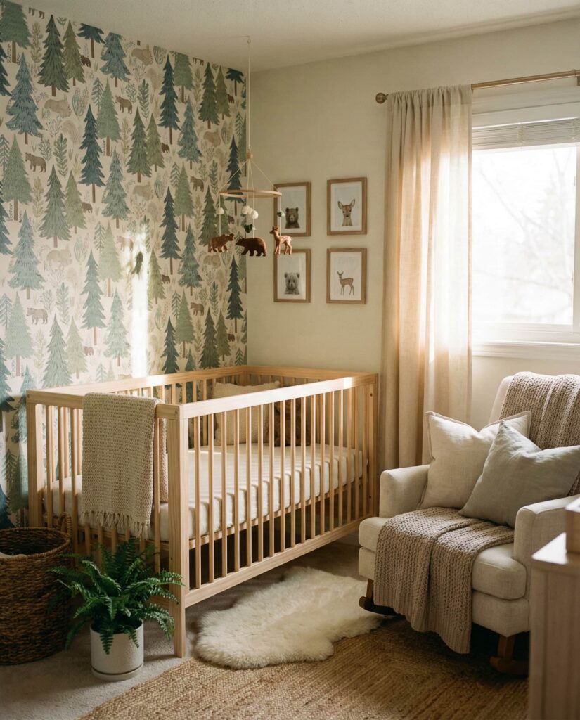 A Woodland nursery remains a favorite because it feels grounded and endlessly adaptable. In this room, layered textures, soft animal motifs, and muted green and blue tones create a neutral, Timeless foundation that works well beyond infancy. Think pine trees, acorns, and forest animals subtly worked into wallpaper or an accent wall, paired with natural wood furniture. Designers often recommend this style because it connects babies to nature while keeping the decor understated. A soft baby atmosphere is achieved through linen curtains, wool rugs, and warm lighting. This idea fits modern homes as well as older spaces, and it pairs beautifully with heirloom pieces, making it both practical and emotionally resonant for growing families.