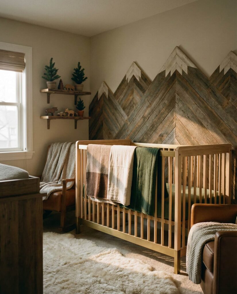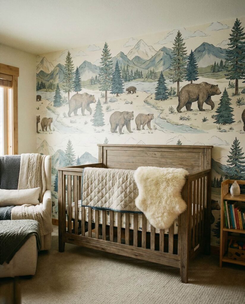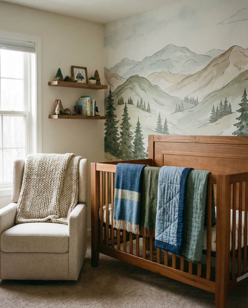 A Mountain–inspired nursery creates a sense of calm escape, echoing the feeling of a cozy cabin tucked into nature. This room style blends layered textiles, warm woods, and illustrated landscapes to form a grounded yet gentle environment. Soft blue skies, muted green pines, and warm neutrals help keep the space neutral and adaptable. Designers often note that mountain themes work well for parents who love travel or outdoor weekends, as they bring personal meaning into early decor choices. Paired with a simple crib and tactile fabrics, this idea feels Timeless, offering visual comfort now and flexibility later. It’s one of those ideas themes that feels calm, intentional, and deeply reassuring.
