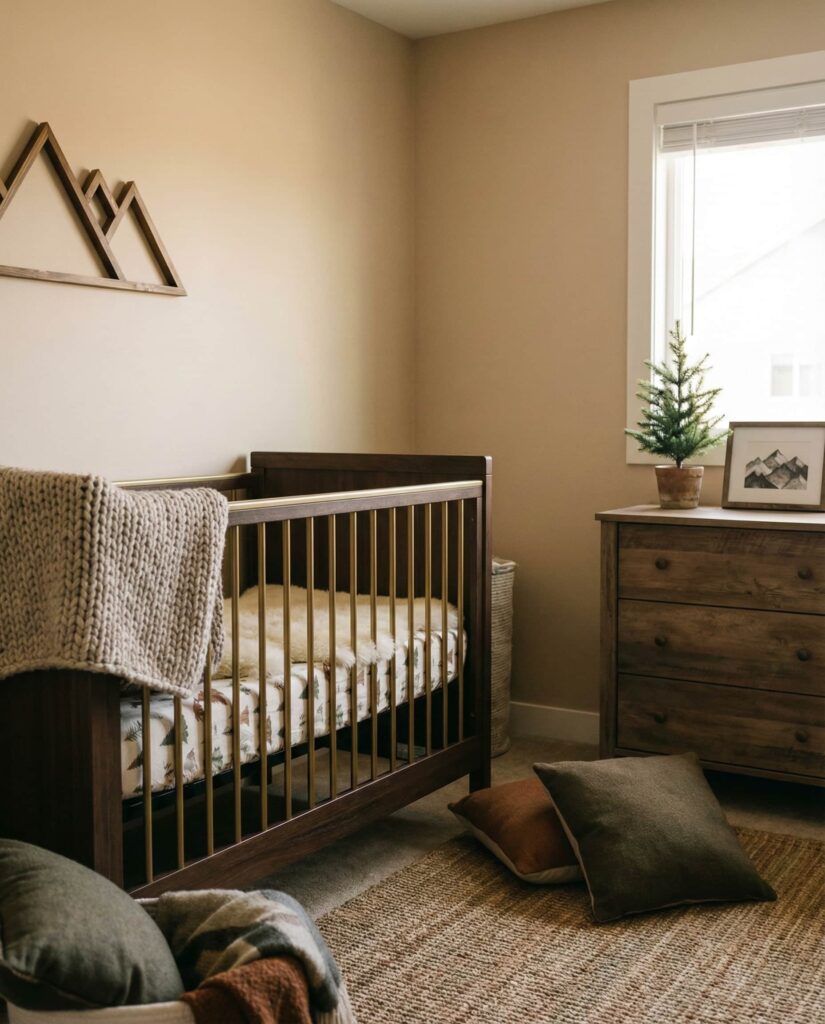 A Mountain nursery draws inspiration from alpine cabins and wide open landscapes. Earthy tones, layered textiles, and simple shapes create a grounded, peaceful room. Often paired with a gold crib for contrast, this style feels elevated yet cozy. Designers appreciate how mountain-inspired spaces connect children to the outdoors while maintaining a refined interior look. It’s a strong choice for families who love travel, hiking, or rustic-modern design influences.