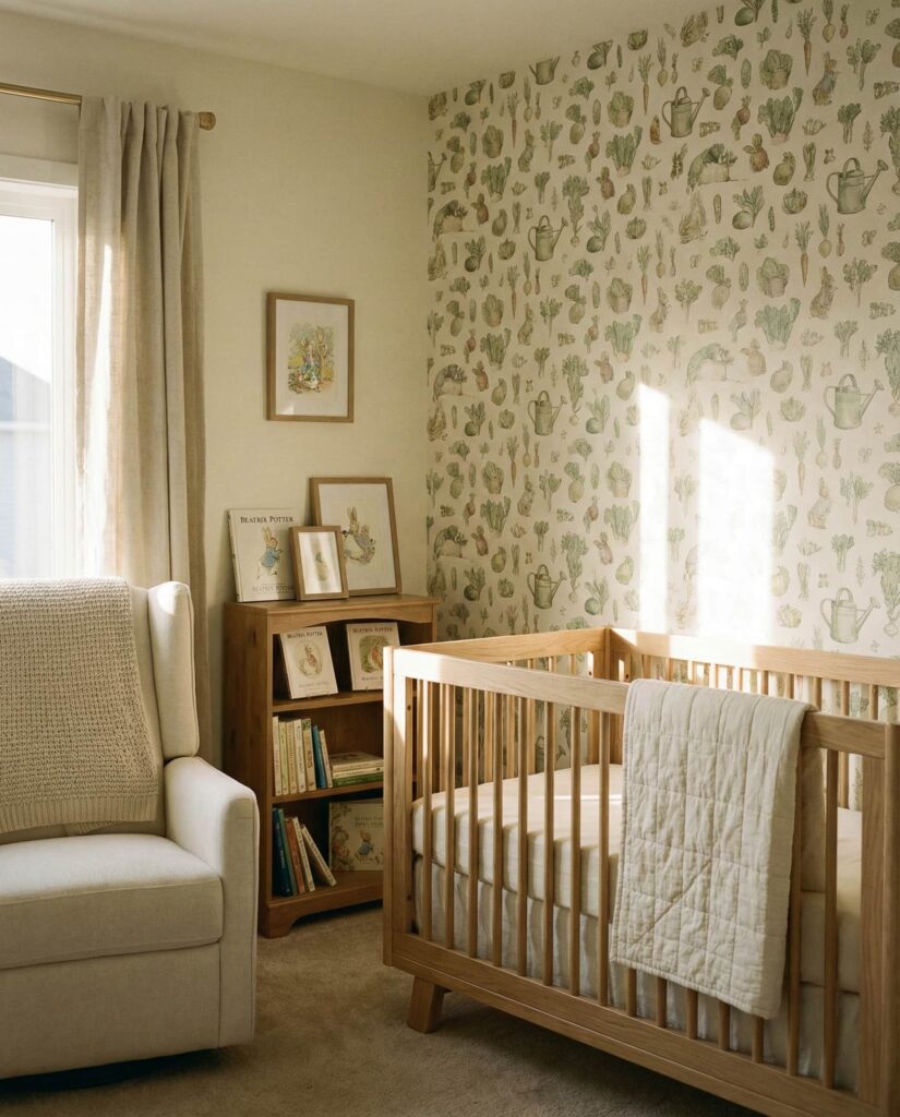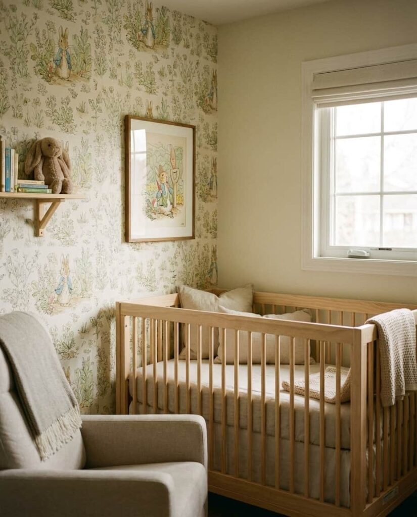 A Peter rabbit–inspired nursery brings gentle storytelling into a baby’s room through soft illustrations, garden motifs, and muted earthy tones. This style often blends watercolor animals with leafy borders, creating a peaceful connection to nature that feels literary rather than themed. Designers frequently mention Beatrix Potter–style rooms as ideal for parents who love classic books and understated decor. Pale green, warm cream, and touches of natural wood keep the space neutral and welcoming. As part of modern ideas themes, this approach feels Timeless, encouraging imagination while remaining calm and visually balanced, perfect for a nursery that grows gracefully with the child.