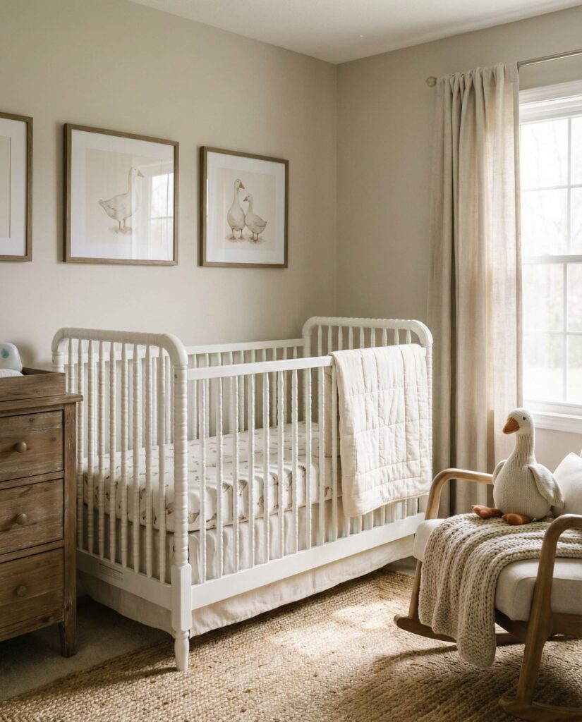 The Goose nursery trend fits beautifully into farmhouse and cottage-inspired homes. Using simple bird illustrations, light textiles, and warm neutrals, this room idea feels wholesome and calm. Influenced by European nursery styles often featured on design blogs, it emphasizes softness and restraint. The palette usually includes cream, pale blue, and touches of green, making it an easy neutral option. This is one of those ideas that feels quietly personal—less about bold statements and more about creating a nurturing environment through thoughtful decor and gentle visual rhythm.