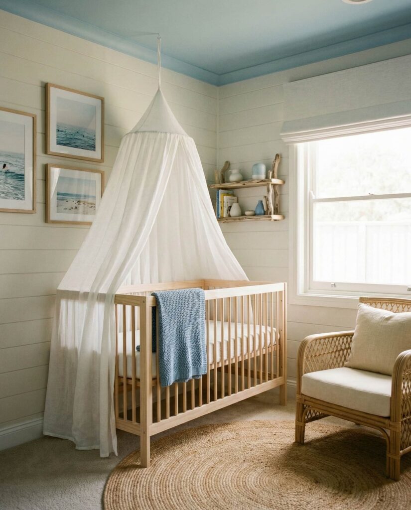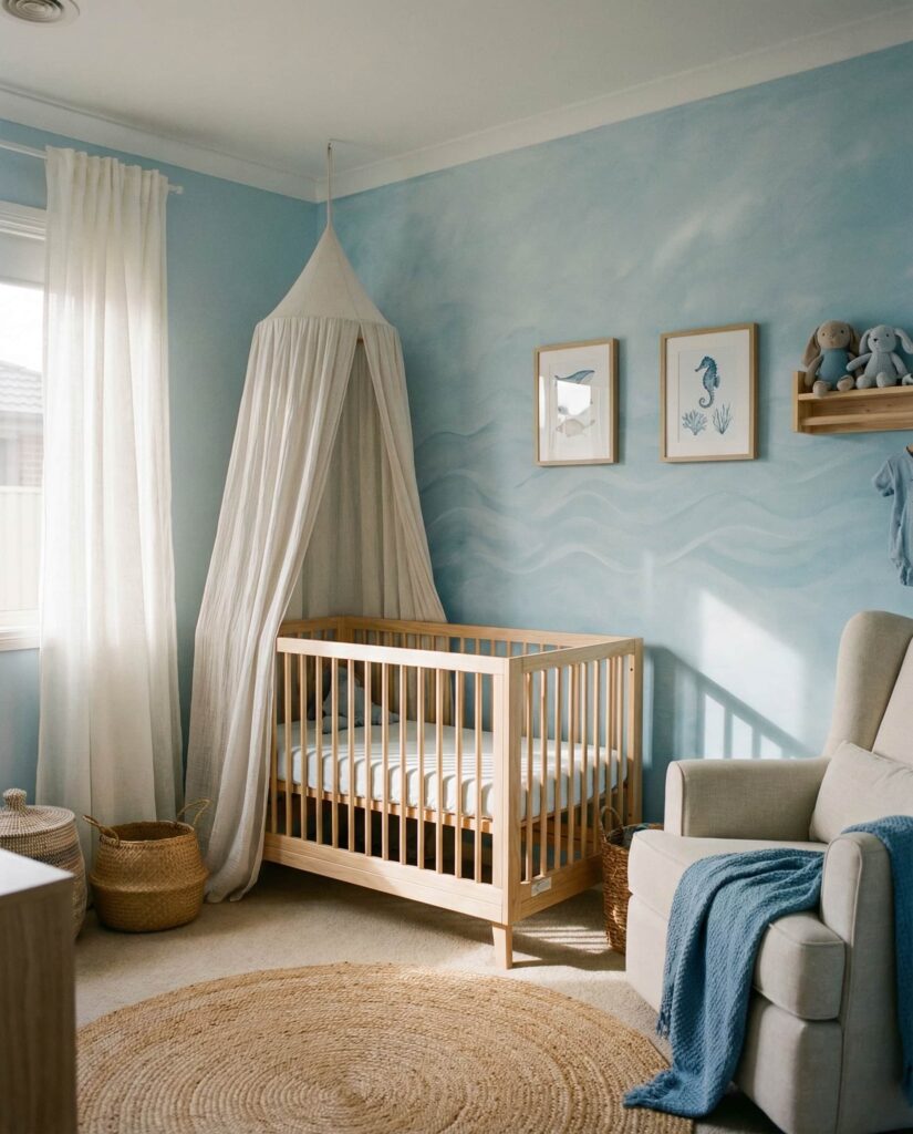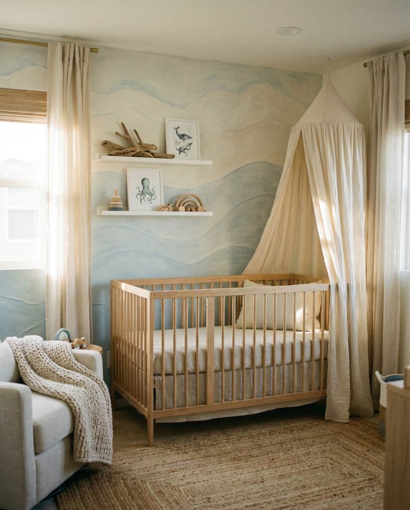 An Ocean nursery brings calm movement and openness into a small space. Rather than bold nautical stripes, modern interpretations favor soft blues, sandy neutrals, and abstract wave patterns in wallpaper or an accent wall. This room idea is popular on coastal design blogs because it feels fresh without being seasonal. Gentle references to water and sky create a soothing rhythm, ideal for sleep and quiet moments. Paired with light wood and airy fabrics, the ocean theme feels expansive and emotionally grounding for both baby and parents.