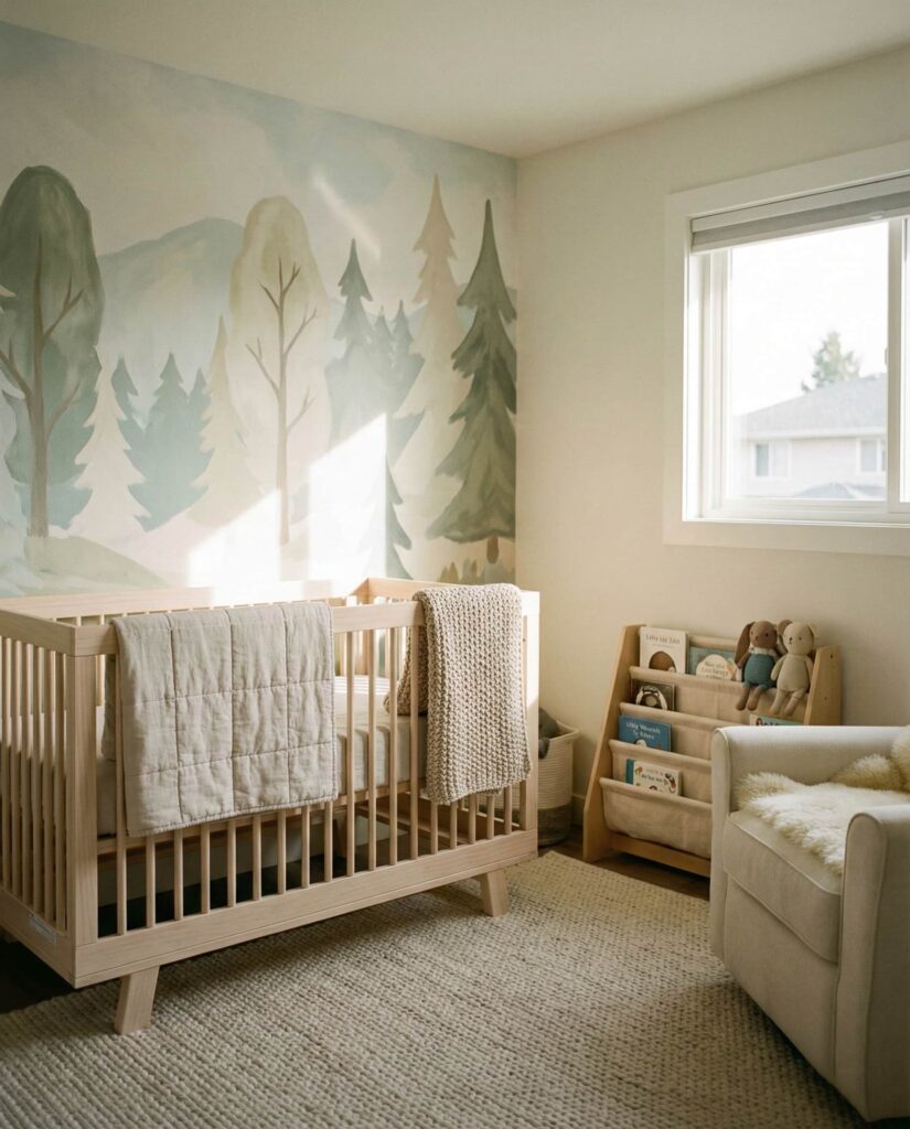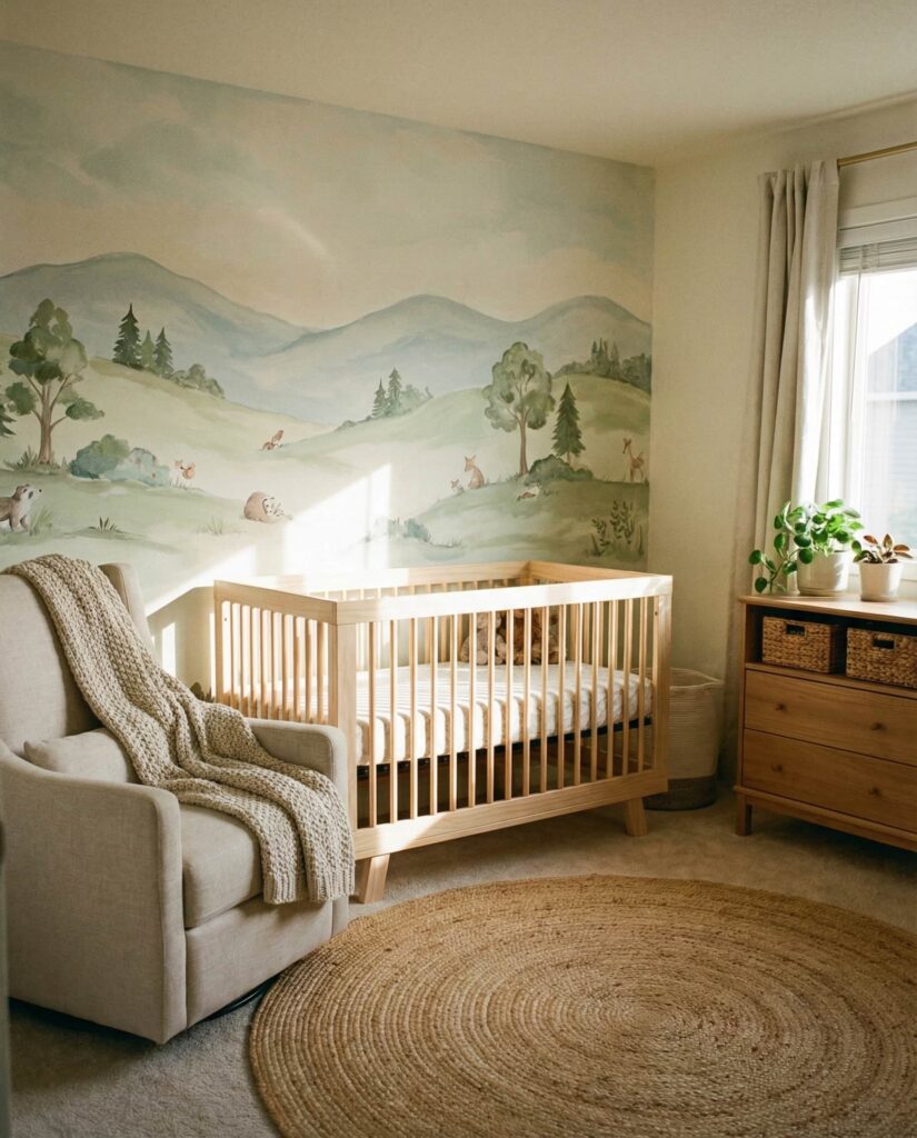 An Accent wall can define a nursery without committing the entire room to a theme. Popular choices include mural-style landscapes, abstract forests, or soft animal scenes that connect to nature. Designers often suggest this approach for parents who want visual interest with flexibility. Paired with simple furniture and neutral textiles, the wall becomes a focal point rather than visual noise. This idea fits well into modern decor philosophy—intentional, flexible, and easy to refresh over time.