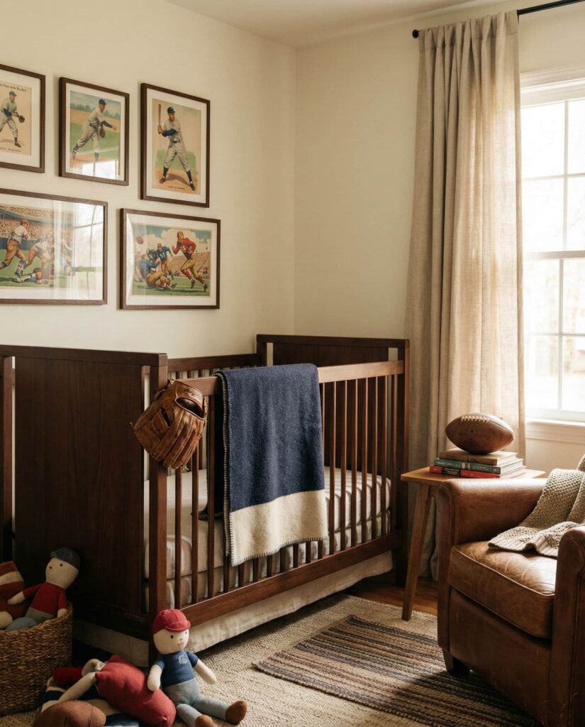 Blending ideas sports vintage with nursery-friendly softness creates a nostalgic yet approachable room. Think old-style illustrations, muted colors, and subtle references to classic American sports culture. Design writers often note that restraint is key—keeping the elements symbolic rather than literal. Soft rugs, warm lighting, and neutral backdrops ensure the space remains baby-appropriate while still reflecting personal interests. It’s a meaningful way to add heritage into early decor choices.