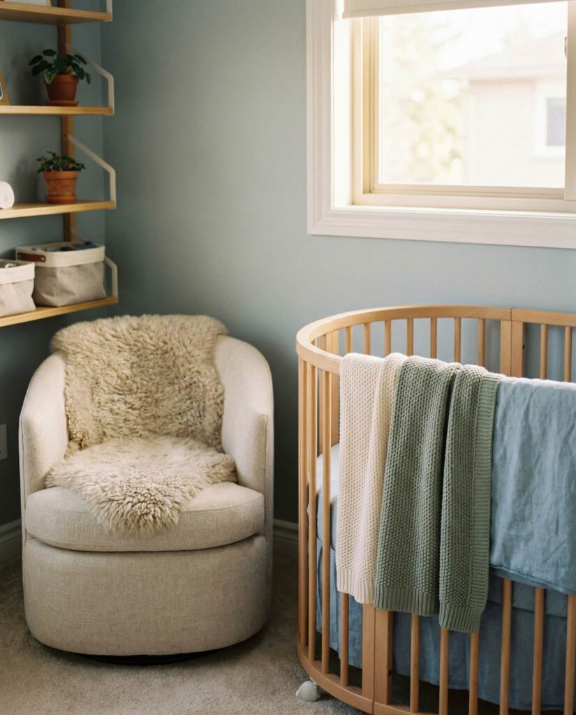 A Soft baby nursery focuses less on theme and more on feeling. Using layered textiles, rounded furniture, and a calm neutral palette, this room prioritizes comfort above all. Designers often highlight these spaces as ideal for first-time parents because they’re easy to adapt. Gentle green or blue undertones add warmth without visual stimulation. This is one of those ideas that proves simplicity can be deeply effective when done thoughtfully.