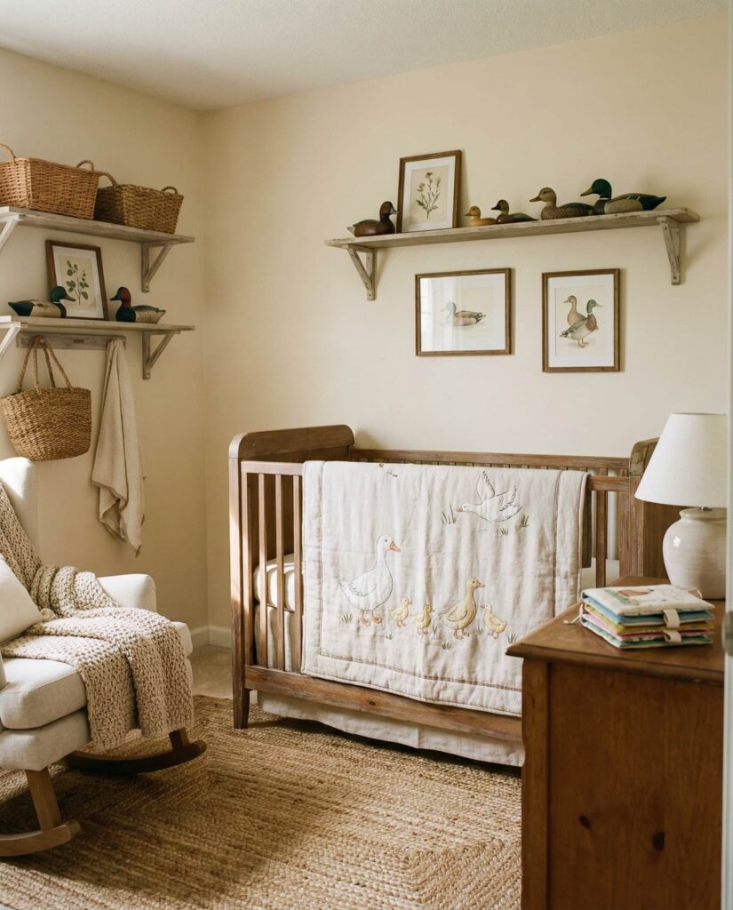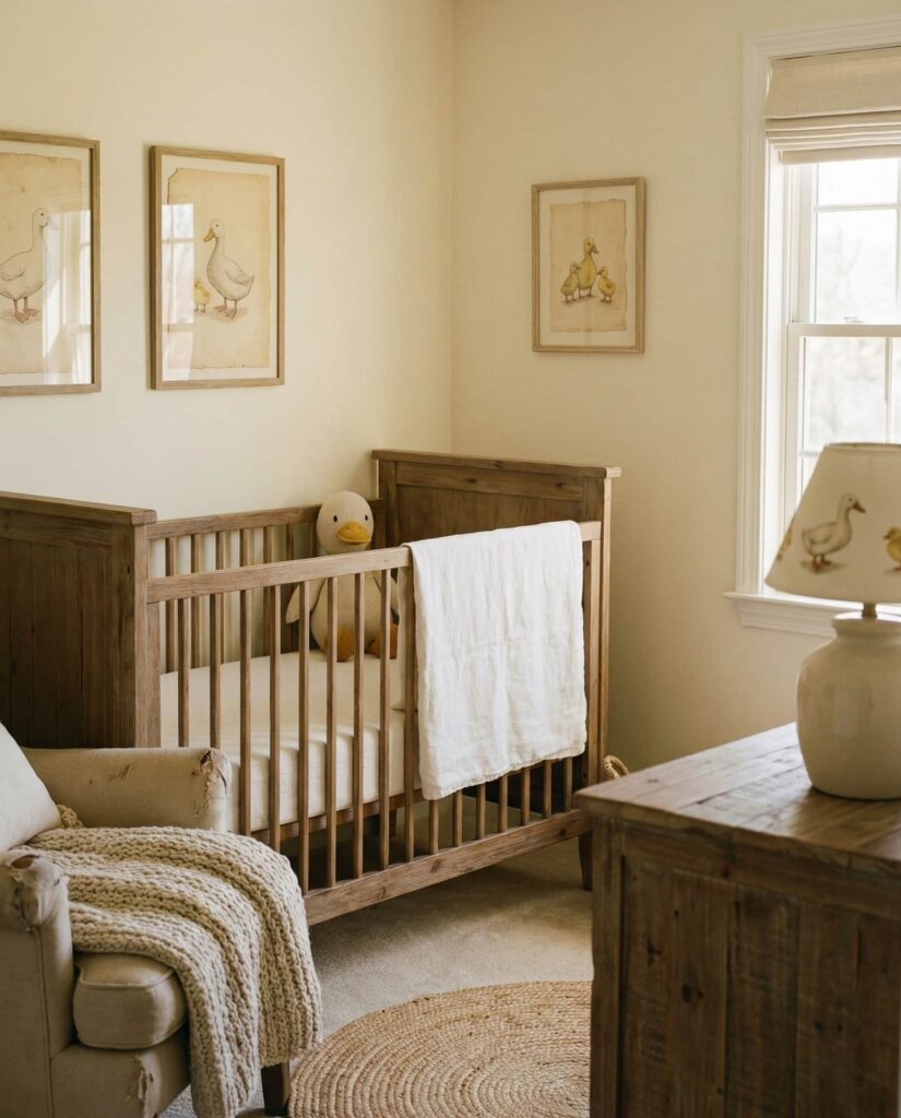 A Duck–themed nursery works best when approached with subtlety. Simple line drawings, muted colors, and rustic textures give the room a country-inspired feel without novelty. Designers often associate this look with traditional homes and rural influences. When balanced with modern furniture, the result feels fresh and intentional. It’s a charming option among classic themes that still feels relevant today.