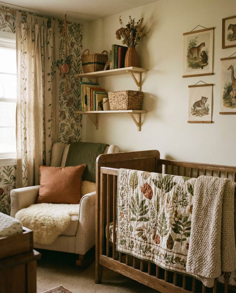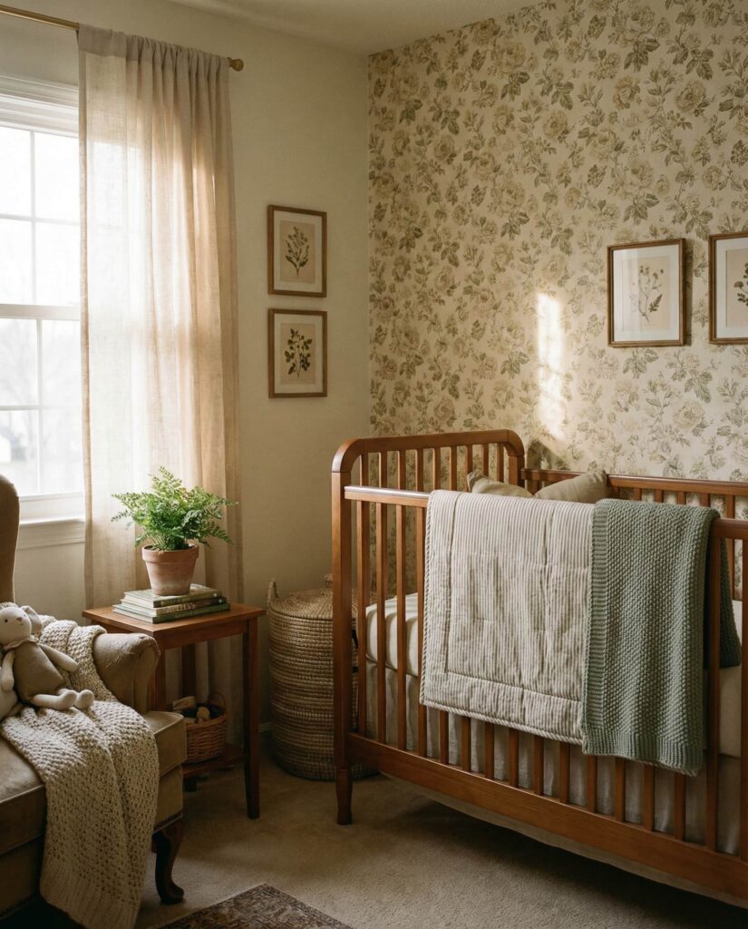 The Cottage core nursery embraces softness, simplicity, and a hand-touched feel. This style often includes vintage-inspired patterns, gentle florals, and warm neutrals layered with green accents. In a baby room, it feels nurturing and personal, especially when mixed with antique-style furniture or handmade details. Designers note that cottage-inspired spaces photograph beautifully while remaining deeply functional. This approach suits parents who want charm without excess, creating a cozy environment that feels collected over time rather than styled all at once.