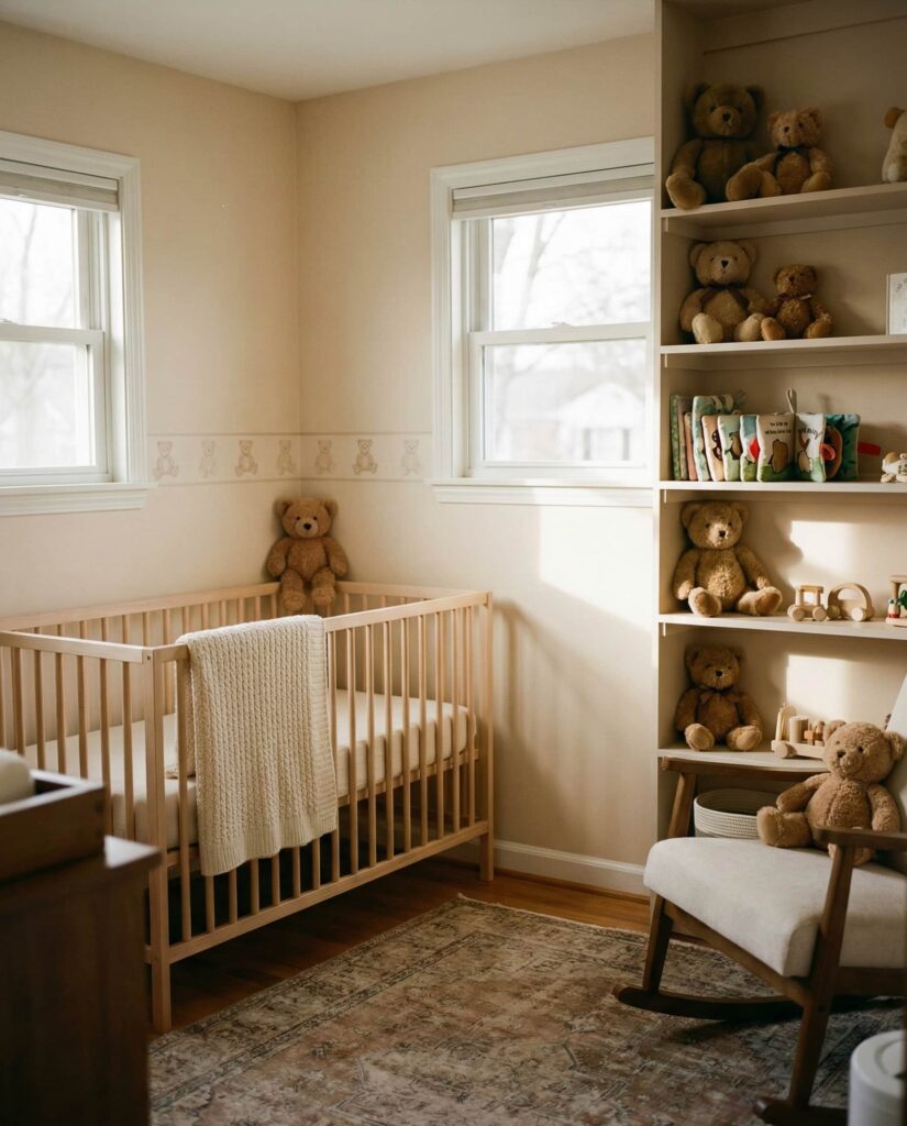 The Teddy bear nursery is a comforting nod to tradition, especially when styled with restraint. A Teddy bear baby theme doesn’t have to feel overly sweet; instead, use plush accents, neutral backdrops, and vintage-style illustrations to create a cozy yet grown-up room. This style often leans into soft creams, gentle browns, and pale blue, allowing the decor to feel warm without overwhelming the space. Many designers point out that teddy bear motifs photograph beautifully and age gracefully. When paired with simple furniture and textured fabrics, this idea becomes less about novelty and more about emotional familiarity—something parents and children alike instinctively respond to.