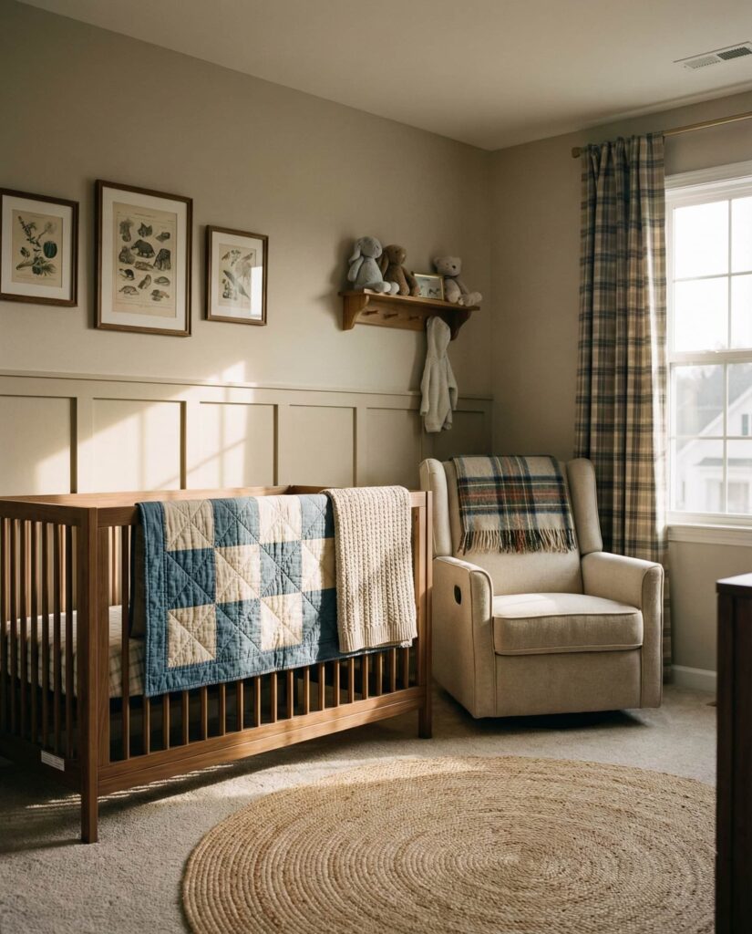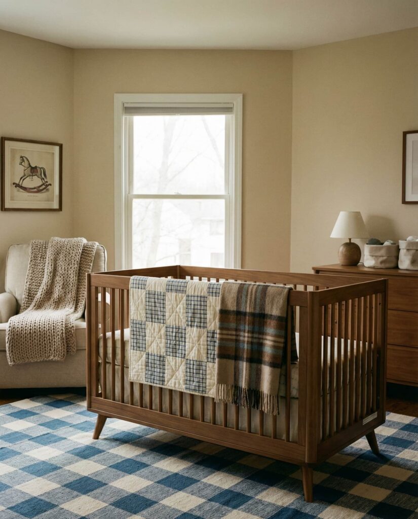 A Checkered nursery takes cues from classic American interiors while updating them for a baby-friendly room. Subtle plaid patterns, inspired by traditional menswear and even ralph lauren aesthetics, add structure without feeling heavy. Balanced with soft fabrics and rounded furniture, this style avoids stiffness and stays welcoming. Designers often recommend keeping the color palette grounded—cream, muted green, or dusty blue—to preserve a Soft baby feel. This is one of those ideas that feels confident and grown-up yet emotionally warm, making it a strong choice for families who appreciate heritage themes with a modern point of view.