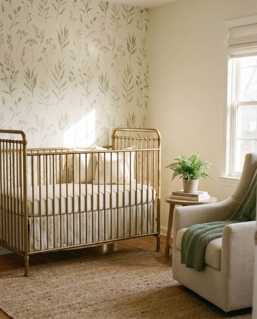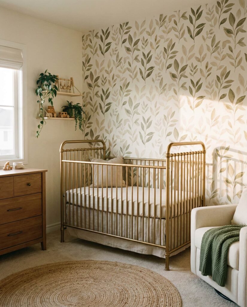 Using a Gold crib as the focal point of a Nature-inspired nursery brings quiet luxury into a calming space. Designers often suggest anchoring statement pieces with restrained surroundings, and this idea follows that principle closely. Soft wallpaper with organic patterns, warm neutrals, and subtle green accents allow the crib to shine without overwhelming the room. The look feels elevated but not flashy, blending modern taste with natural softness. Among current room ideas, this approach stands out for its balance—elegant, soothing, and highly adaptable as the child grows, making it a refined yet practical decor choice.