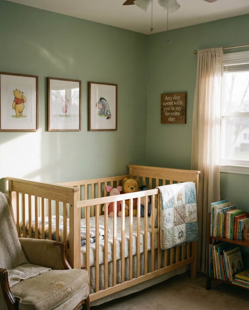 A Winnie the pooh nursery works best when inspired by the original illustrations rather than bold cartoon graphics. Using Winnie the pooh baby elements in soft watercolor tones creates a gentle, literary feel that appeals to parents who value storytelling. This room style often includes framed book pages, honey-toned accents, and muted green walls for balance. Designers from classic decor blogs often emphasize how storybook themes encourage imagination without visual clutter. The result is a nursery that feels warm, nostalgic, and emotionally rich—one that subtly introduces a child to characters while remaining tasteful and refined.