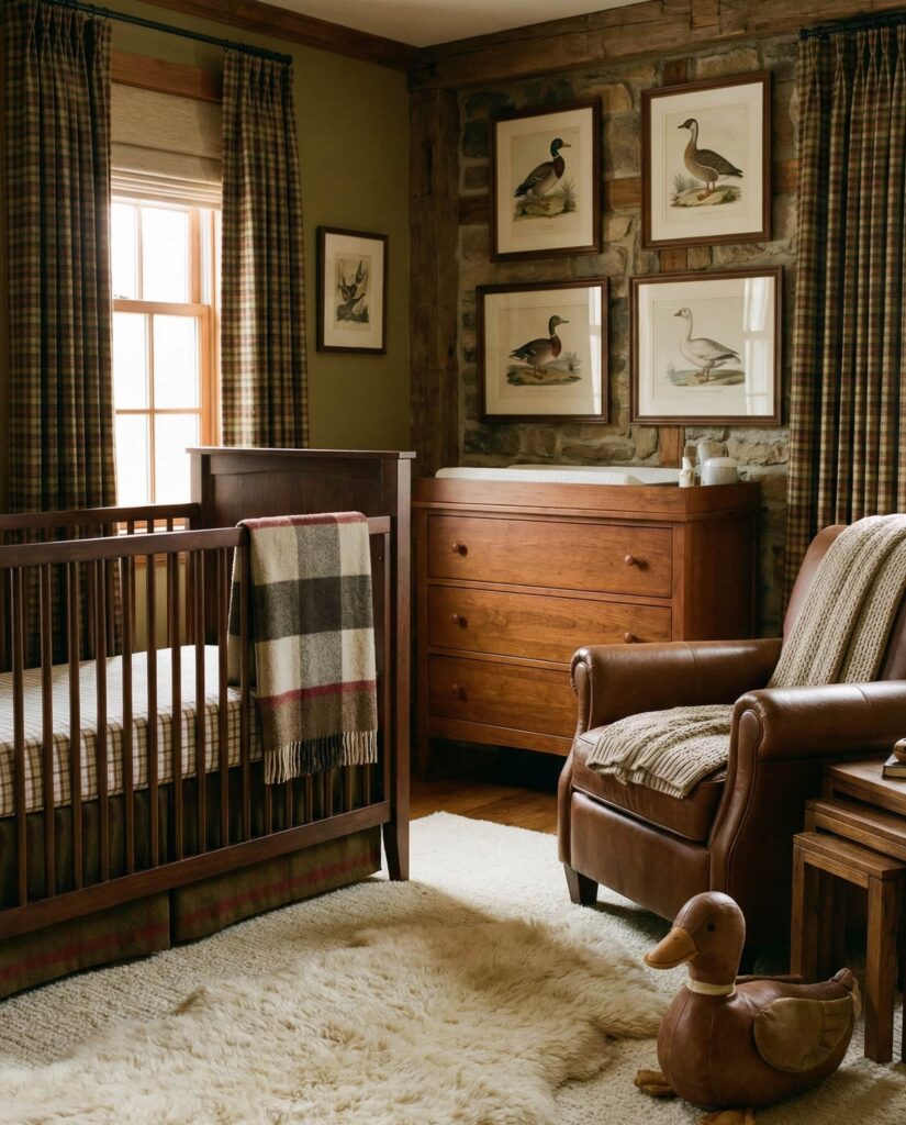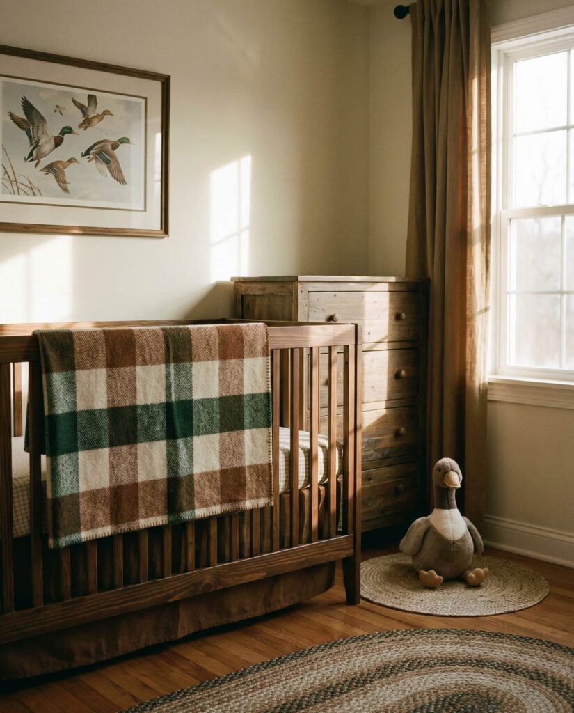 A refined Hunting theme nursery draws inspiration from classic Americana rather than novelty prints. With Hunting, Ideas hunting, and rustic references, this room often includes plaid or checkered textiles, warm wood tones, and subtle animal imagery like a Duck or Goose illustration. Influenced by traditional cabins and Ralph Lauren aesthetics, this style feels grounded and masculine without being harsh. It works especially well in homes that already lean traditional, offering continuity in decor while still feeling appropriate for a baby. The key is balance—heritage elements softened with plush fabrics and gentle lighting.