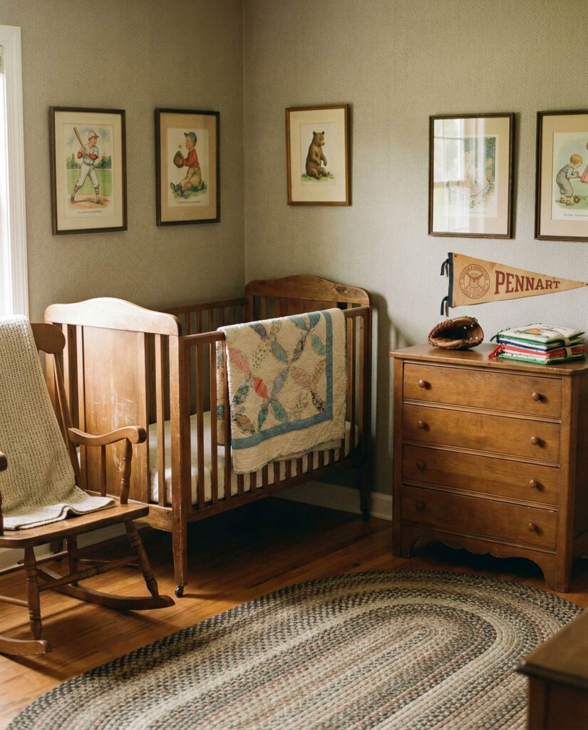 A Vintage american baby nursery celebrates nostalgia through classic prints, muted colors, and heirloom-style furnishings. Often overlapping with ideas sports vintage, this room may include subtle references to old illustrations, classic toys, or historic color palettes. Design editors frequently highlight this style for its ability to feel meaningful rather than trendy. When done thoughtfully, it becomes a space that feels storied and authentic—perfect for families who value tradition and personal history in their decor choices.