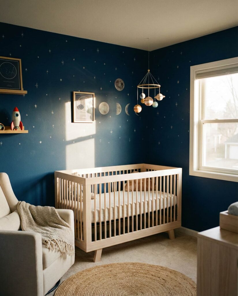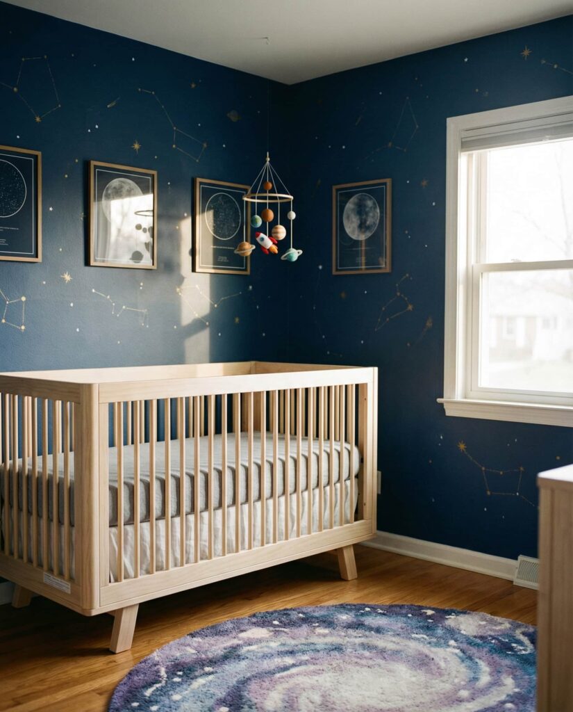 A Space nursery taps into curiosity and imagination while remaining surprisingly calm when styled correctly. Using deep blues balanced with soft neutrals keeps the room from feeling dark. Stars, planets, and subtle metallic accents add interest without visual noise. Design writers often note that space themes grow well with children, transitioning easily into toddler and school-age years. This idea blends learning and comfort, making it a smart long-term choice.