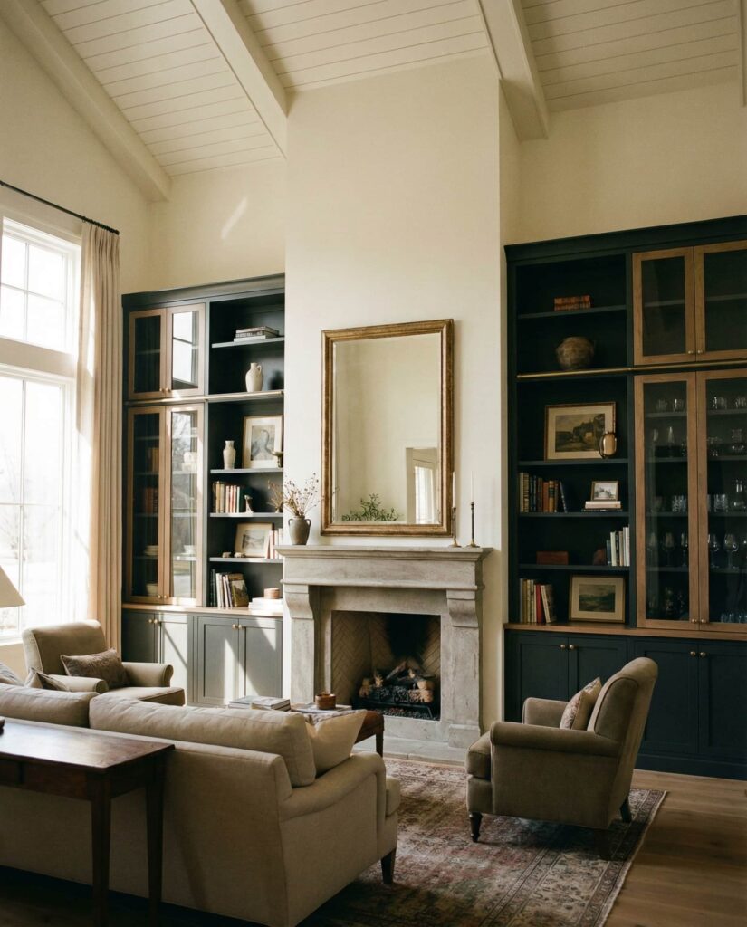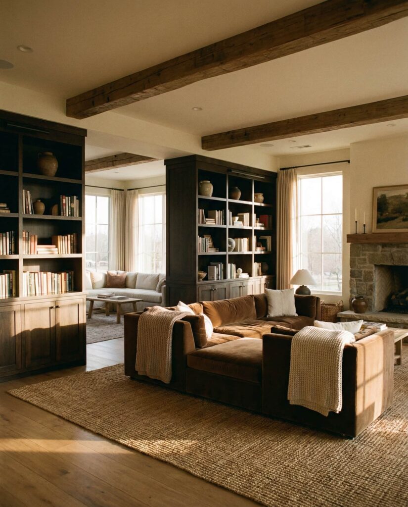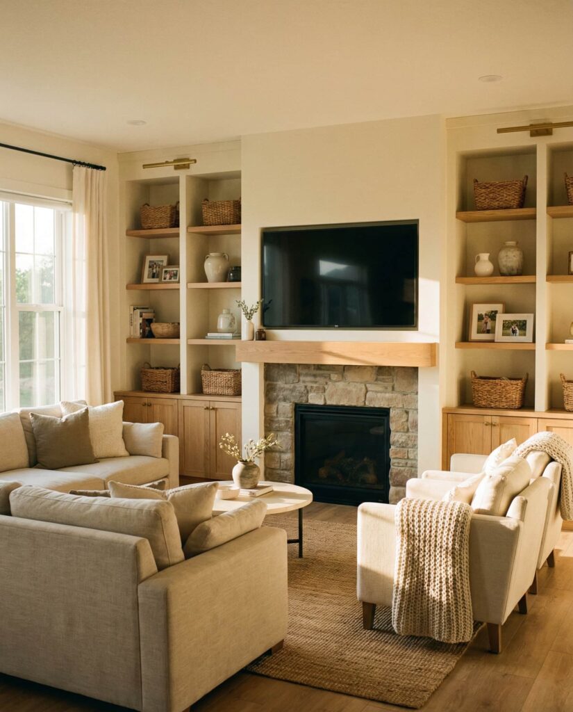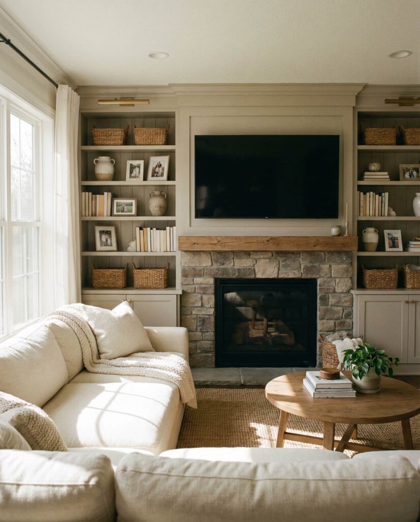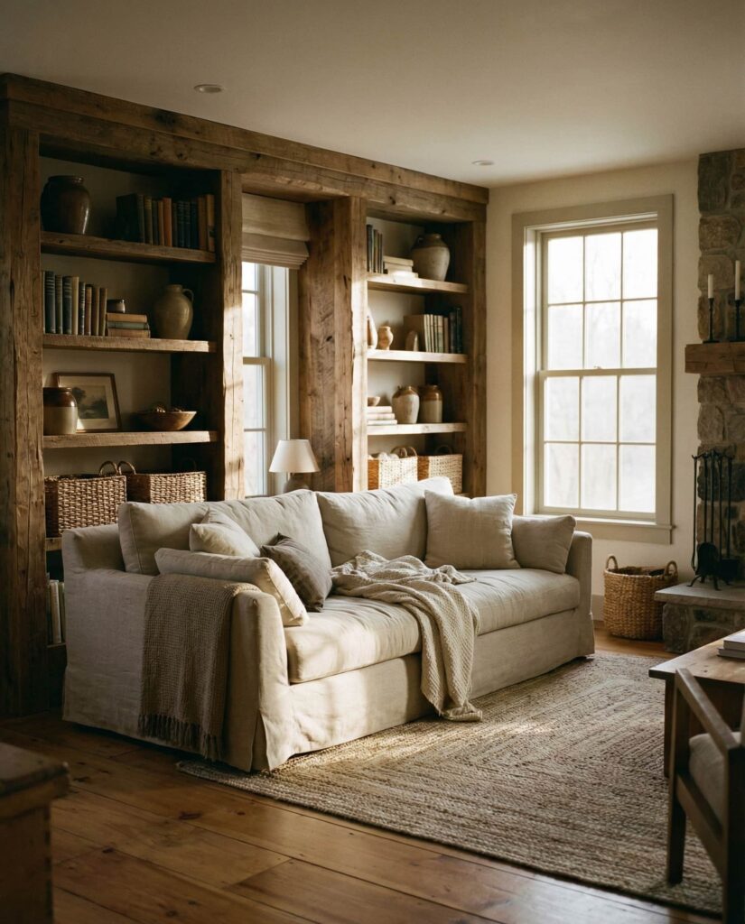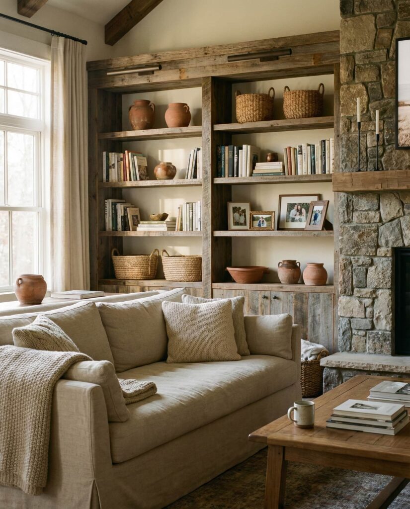 Built-ins designed to anchor the seating zone create a grounded, welcoming living room. Rustic shelves behind or beside the Couch define the space without closing it off. I’ve noticed homeowners enjoy how Rustic textures and Wooden finishes add warmth, especially when paired with neutral upholstery and understated Decorating. This idea prioritizes comfort and everyday use, making the living room feel like a place meant to be lived in, not just styled.
