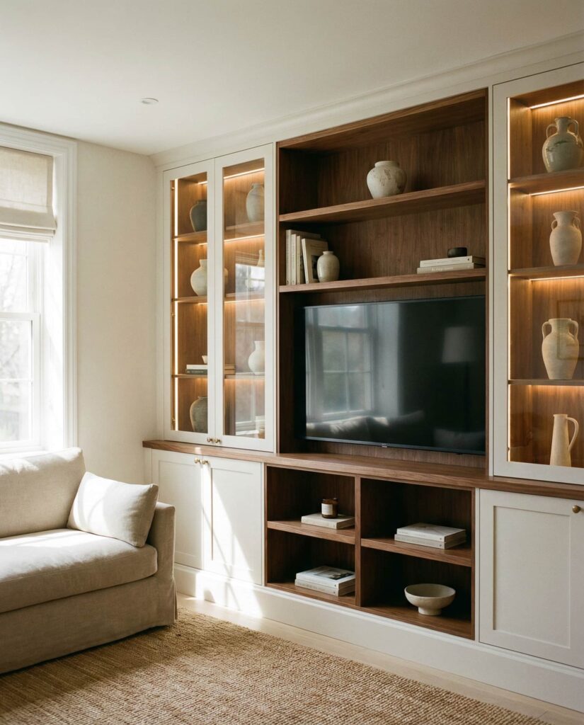 Built-in shelves that incorporate Glass display cabinets are becoming a refined choice for homeowners who want storage without visual heaviness. This idea works especially well in a Large living room where transparency keeps things open while still framing a Tv or media zone. In homes with High ceilings, glass-front uppers balance solid lower cabinets and allow curated Decorating pieces to shine. I’ve noticed clients appreciate how this layout feels both Modern and personal, especially when paired with a neutral White or soft Brown palette and subtle interior lighting that enhances evening styling without overpowering the room.