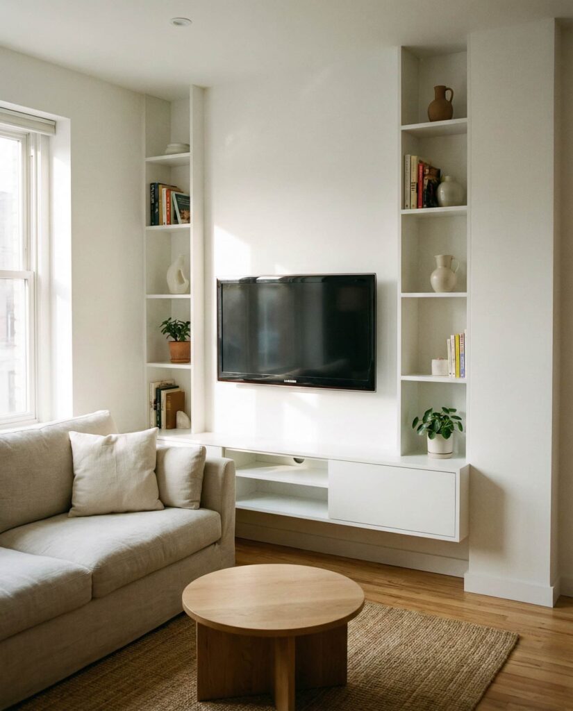 When working with a small space, built-in shelves often replace bulky furniture entirely. This approach focuses on shallow depth, vertical storage, and smart placement with tv mounted cleanly at eye level. I’ve seen this solution transform apartments where every square foot matters, especially when shelves run wall-to-wall and incorporate hidden storage below. A light White finish or pale Painting choice helps reflect light, making the room feel larger. The result is practical, calm, and far more livable than freestanding units competing for space.
