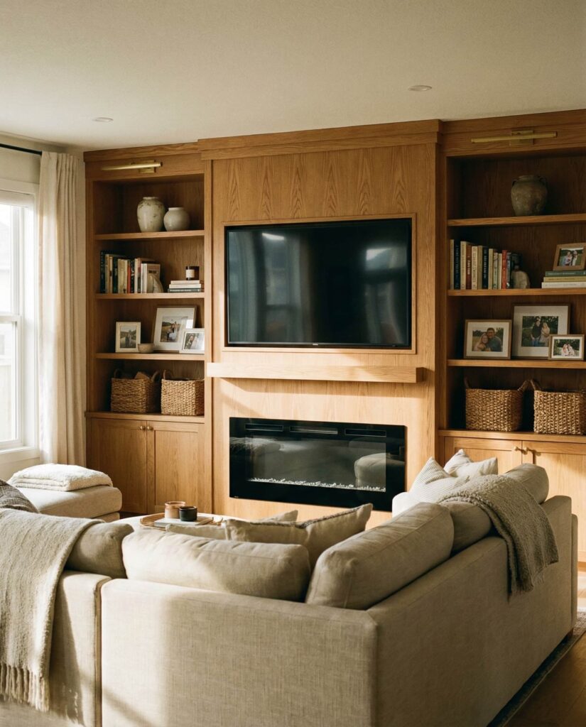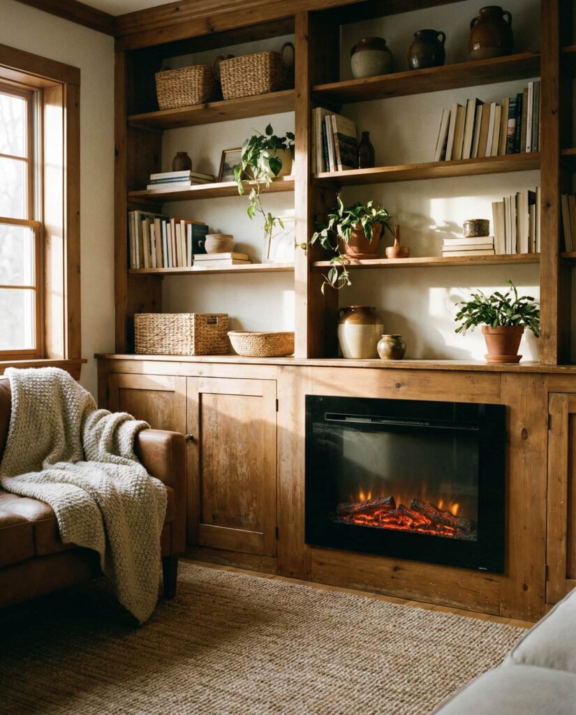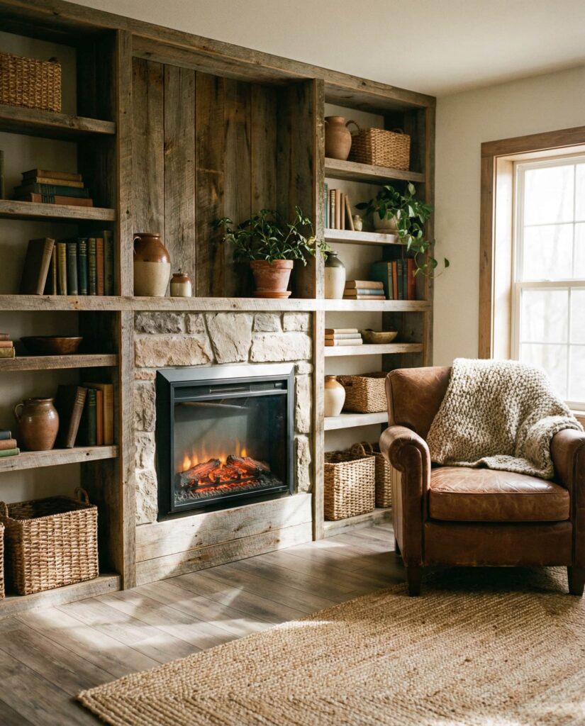 Rustic built-in shelves made from Wooden materials bring a sense of history and comfort to living rooms. This look is especially popular in suburban and rural homes where warmth matters more than polish. I’ve seen reclaimed wood shelves paired with modern sofas and an Electric fireplace, creating contrast that feels collected rather than themed. The key is restraint: letting the wood grain speak while keeping accessories simple.