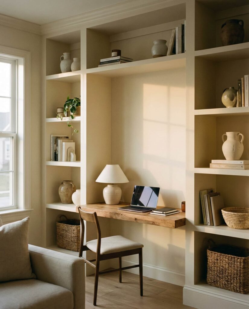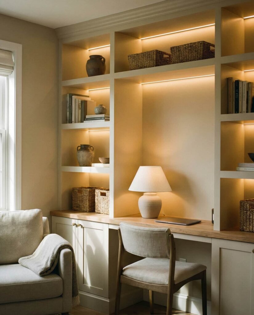 Living rooms that double as work zones benefit from shelves with desk thoughtfully built into the design. Rather than adding a separate office setup, the Desk becomes part of the shelving composition, often tucked into an alcove or side wall. I’ve seen this approach resonate with households balancing remote work and family life. Neutral Painting, integrated lighting, and simple styling help the workspace blend in, allowing the room to shift easily from productive mornings to relaxed evenings on the Couch.