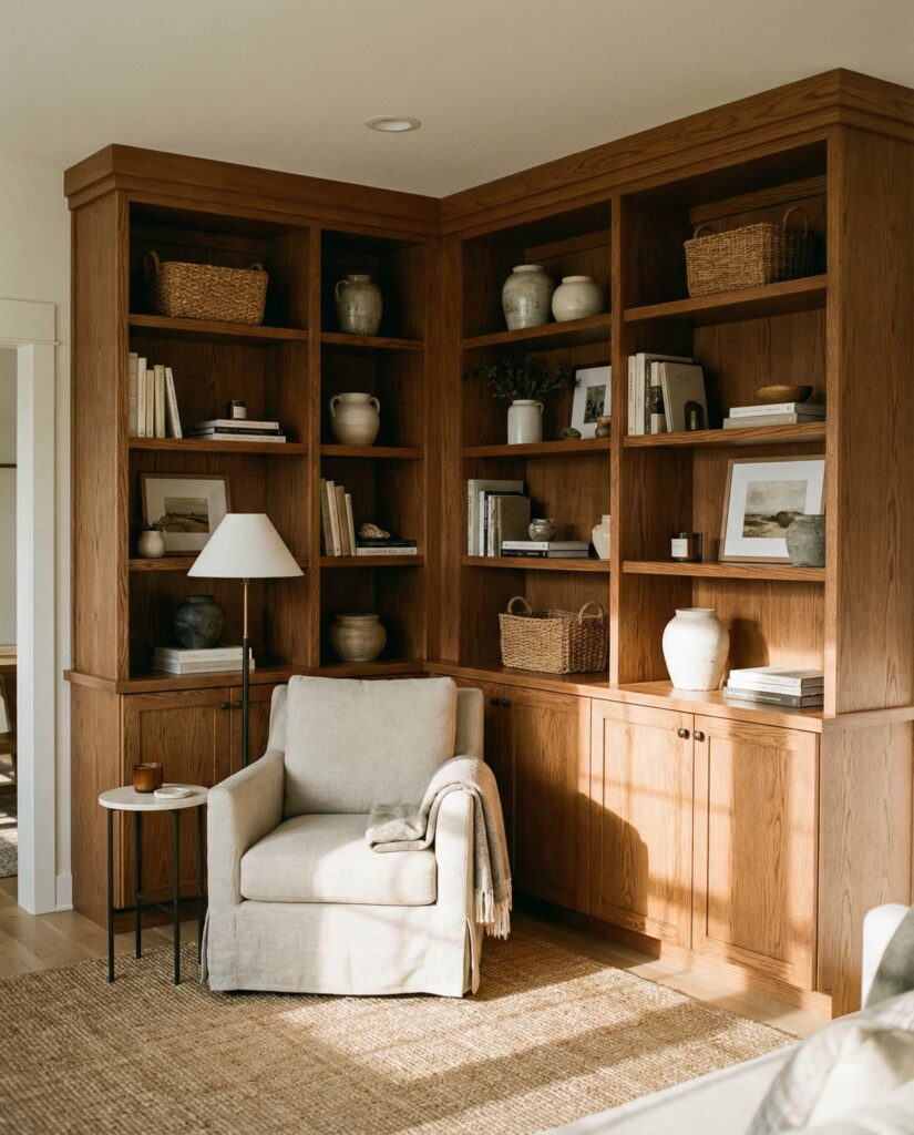 Designing shelves for a Corner layout is an effective way to make overlooked areas work harder. Built-ins that wrap a corner wall or integrate a Corner fireplace create flow and visual continuity. I’ve seen this idea work particularly well in open-plan homes where defining zones matters. Using warm Brown wood tones or a soft Rustic finish adds depth without closing off the room, making the corner feel intentional rather than leftover space.