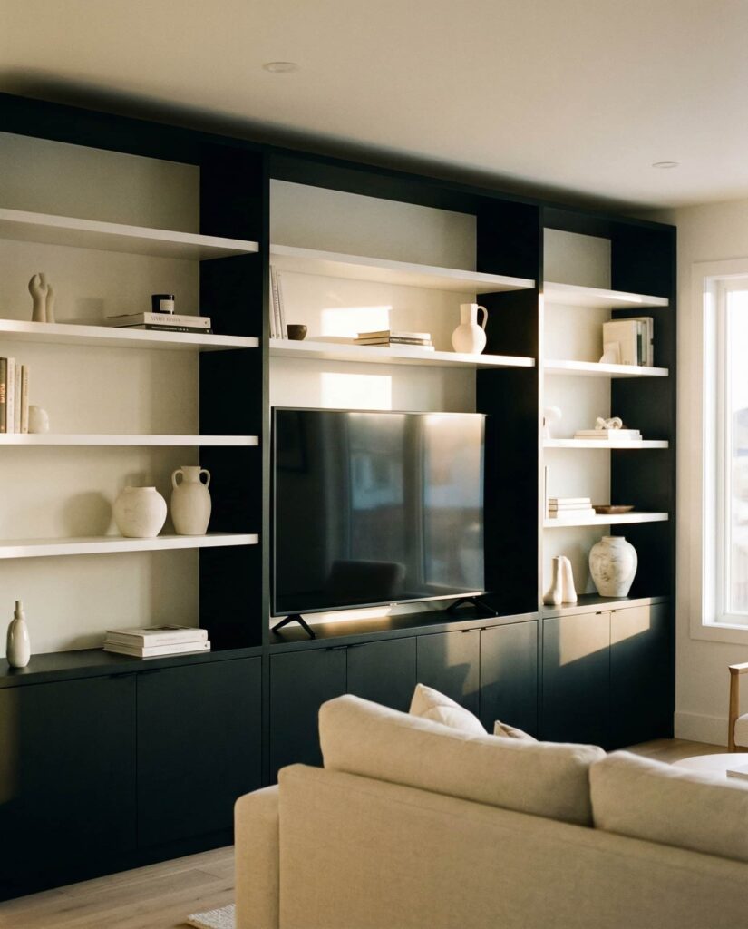 High-contrast Black and White built-in shelves deliver a crisp, contemporary look that feels tailored yet approachable. This style often frames a Tv wall while allowing decor to pop against a structured backdrop. I’ve seen homeowners gravitate toward this palette when they want a Modern feel without committing to bold colors. Careful Decorating and restrained accessories keep the shelves looking intentional rather than busy.