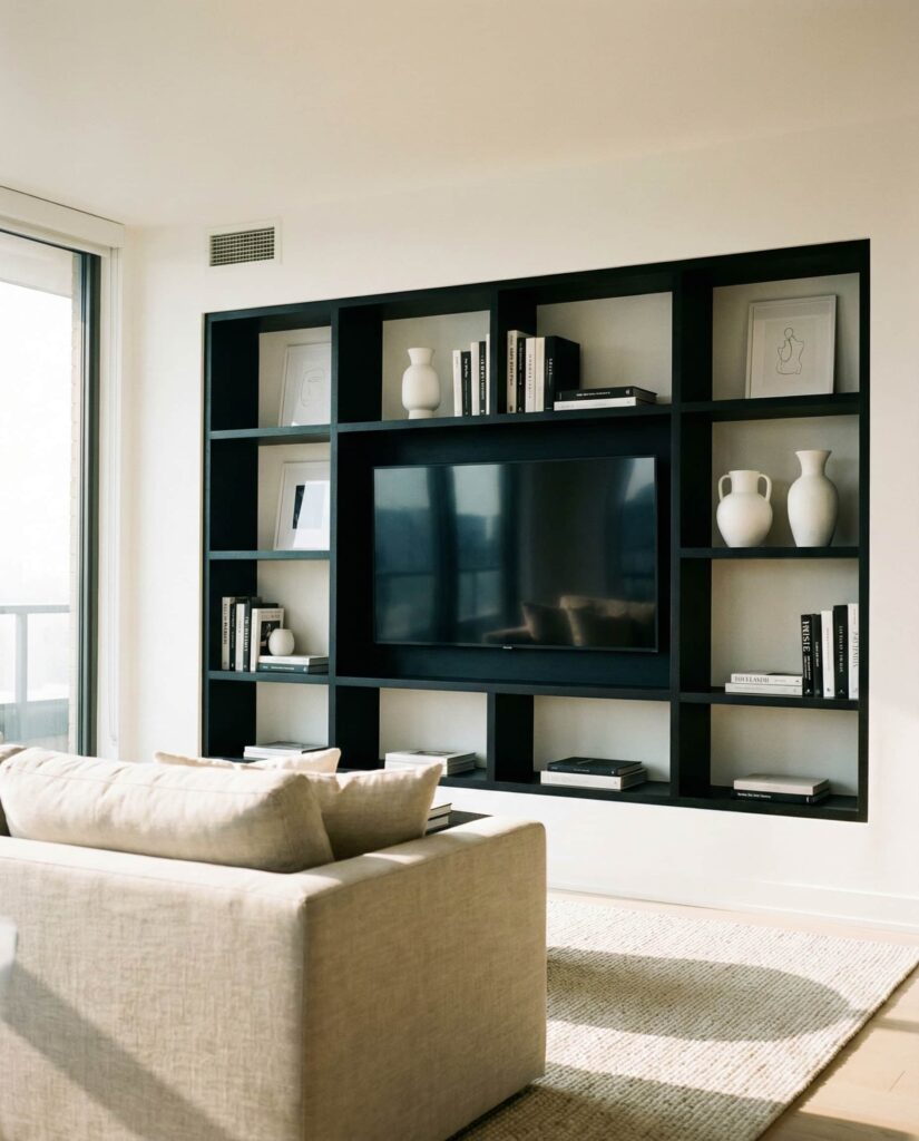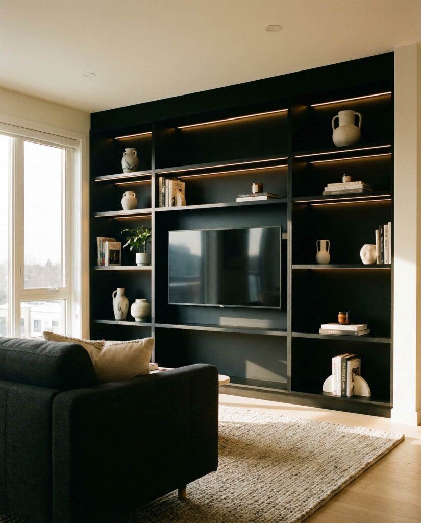 Black built-in shelves have moved from bold statement to modern classic. When done right, they frame a Tv beautifully and make art and objects pop. I’ve noticed this look resonates with homeowners inspired by features from Dwell, especially in open-plan homes. Matte finishes, integrated lighting, and minimal Decorating keep the shelves sharp rather than heavy. This style works best in rooms with good natural light to balance the depth of color.