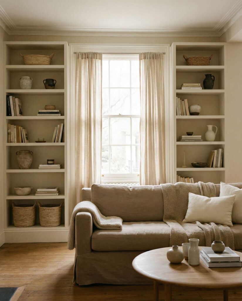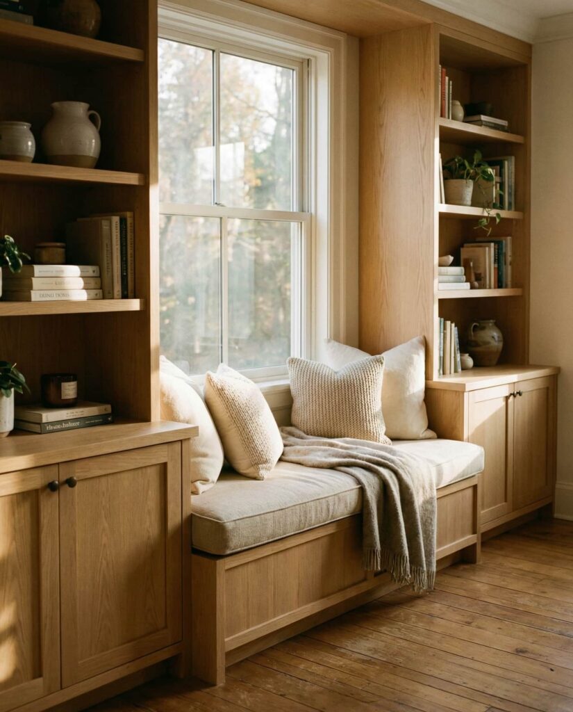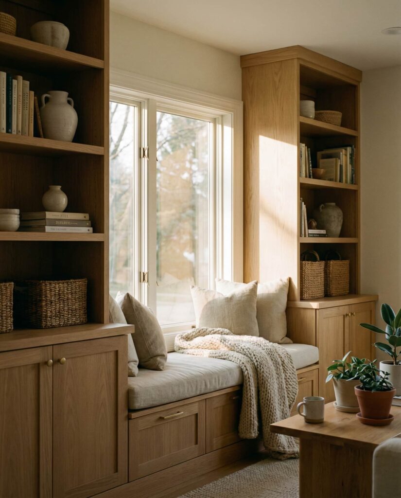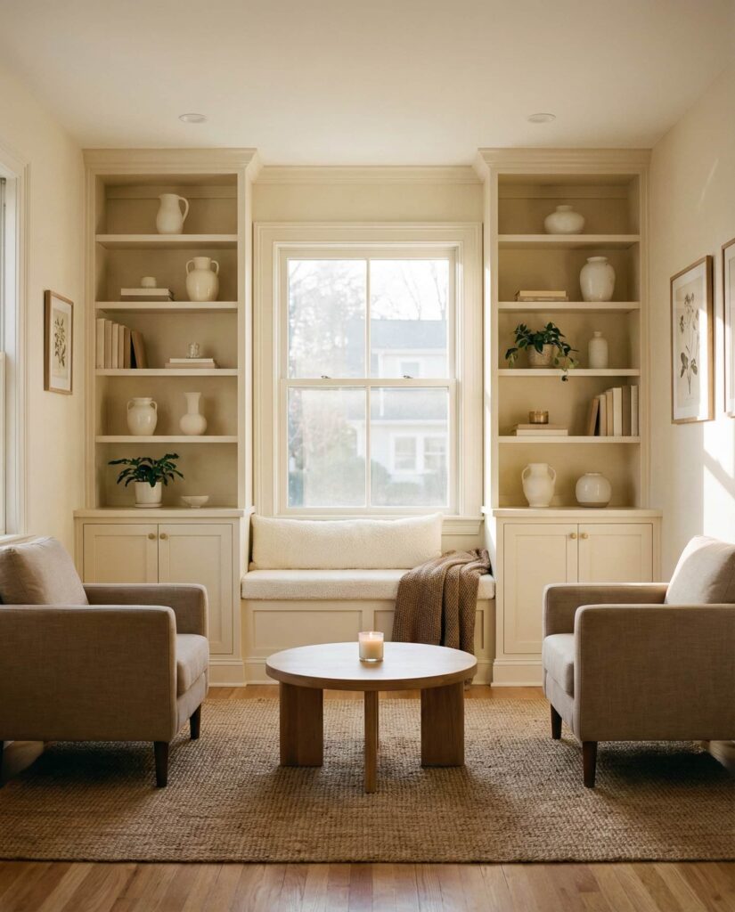 Shelves that combine storage with window seating create one of the most inviting living room features. Built-ins flank the Window, while a low bench offers a casual spot to sit, read, or enjoy light. I’ve noticed this layout appeals to families who value comfort and flexibility. Soft cushions, light Wooden finishes, and relaxed styling make the space feel lived-in without sacrificing order.